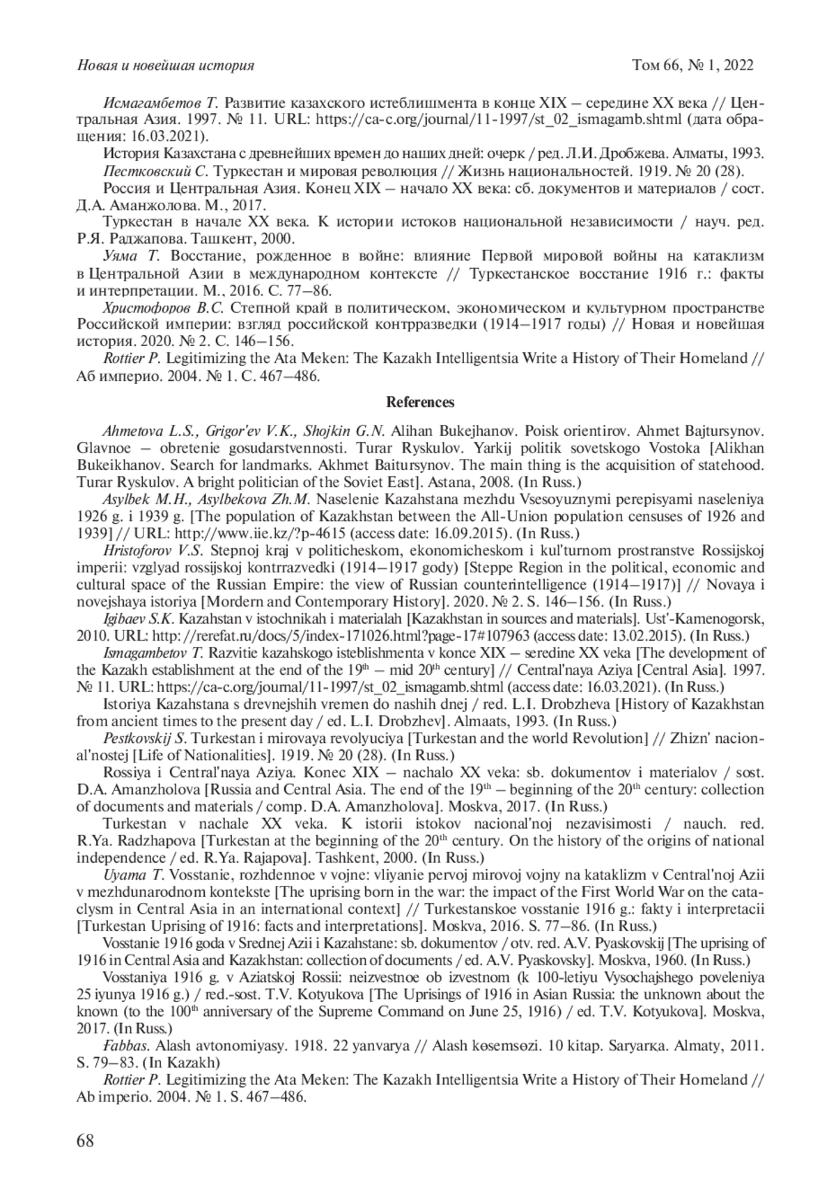 14. Rottier P. Legitimizing the Ata Meken: The Kazakh Intelligentsia Write a History of Their Homeland // Аб империо. 2004. № 1. С. 467-486. EDN: PDWSMJ
