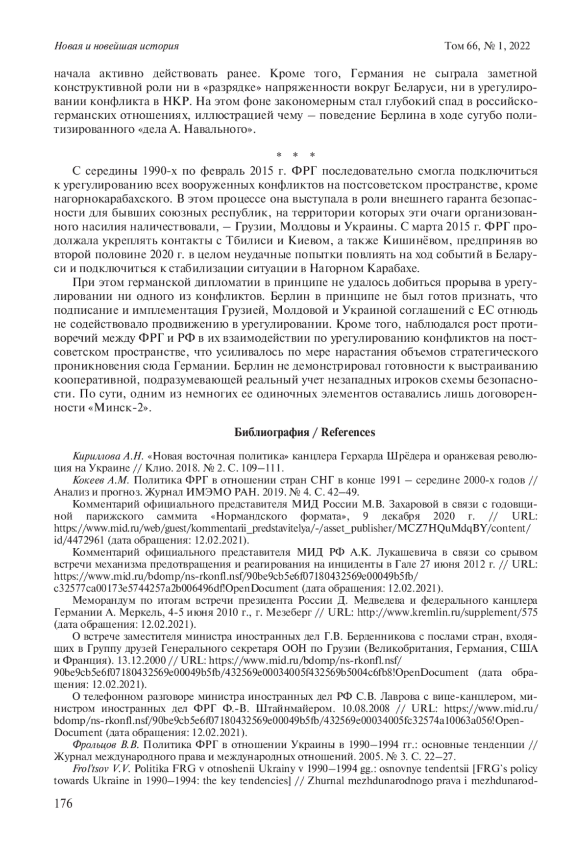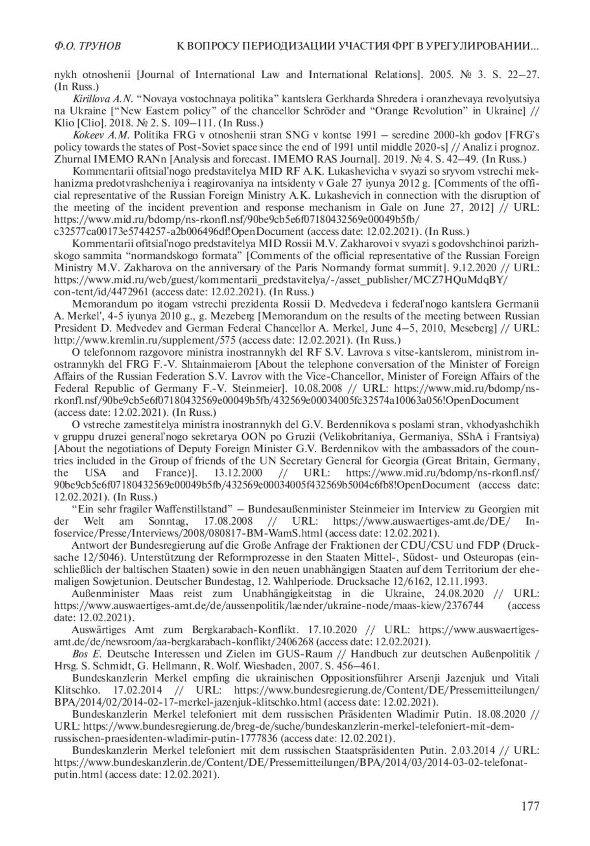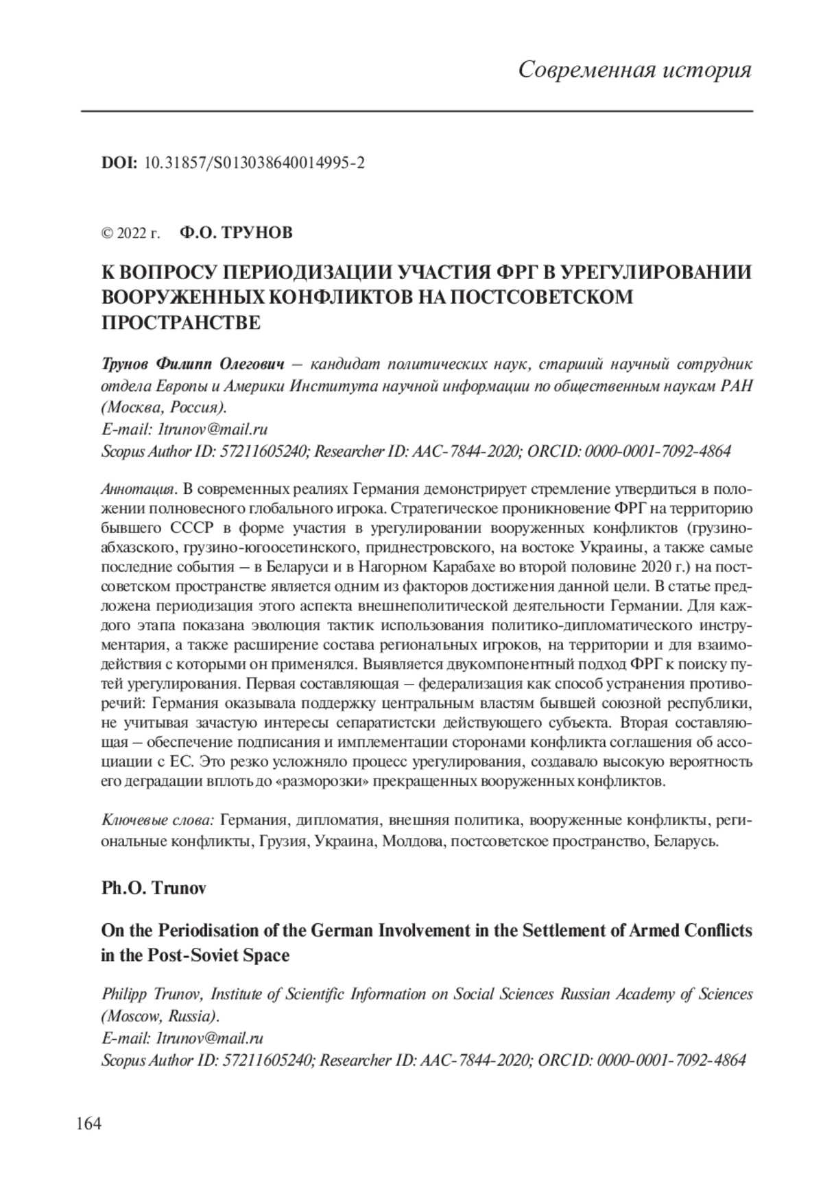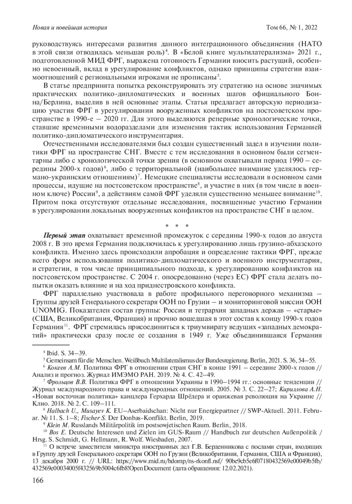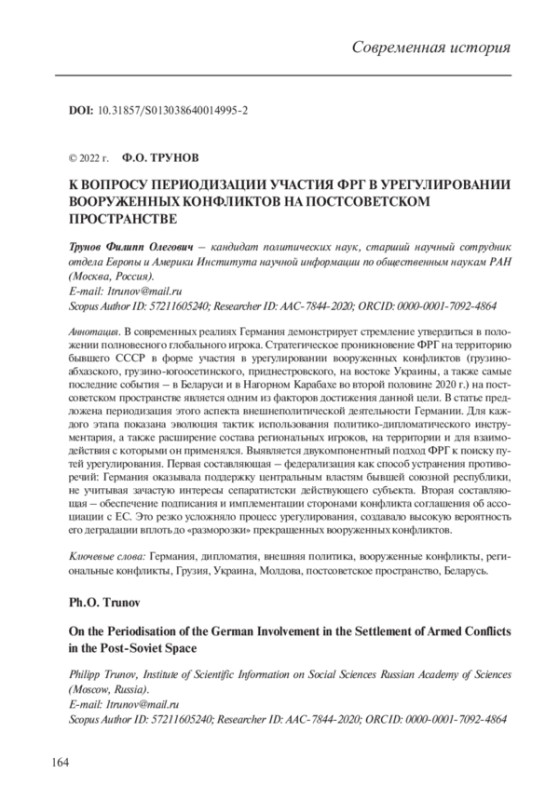 ТРУНОВ Ф. О. К ВОПРОСУ ПЕРИОДИЗАЦИИ УЧАСТИЯ ФРГ В УРЕГУЛИРОВАНИИ ВООРУЖЕННЫХ КОНФЛИКТОВ НА ПОСТСОВЕТСКОМ ПРОСТРАНСТВЕ // НОВАЯ И НОВЕЙШАЯ ИСТОРИЯ. 2022. № 1