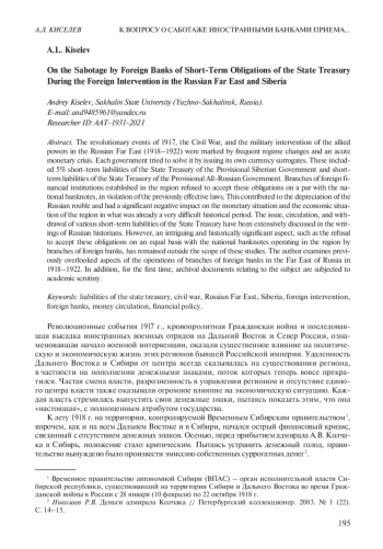 Революционные события 1917 г., Гражданская война и военная интервенция союзных государств на Дальнем Востоке России и Сибири (1918–1922 гг.) характеризовались частой сменой власти и острым денежным кризисом. Каждая власть стремилась решить его, выпуская свои суррогаты денежных знаков. К ним относились в том числе 5% краткосрочные обязательства Государственного казначейства Временного Сибирского правительства и краткосрочные обязательства Государственного казначейства Всероссийского временного правительства. Отделения иностранных финансовых учреждений, открывшиеся в регионе, в нарушение ранее действовавших законов отказались принимать данные обязательства наравне с общегосударственными денежными знаками. Данный факт способствовал падению курса русского рубля и оказал существенное влияние на ситуацию с денежным обращением и экономику региона в и без того сложный исторический период. Вопросы выпуска, хождения и изъятия из оборота различных краткосрочных обязательств Государственного казначейства нашли широкое отражение в трудах отечественных историков. Однако такой интересный и важный исторический аспект, как отказ в приеме данных обязательств наравне с общегосударственными денежными знаками действовавшими в регионе отделениями иностранных банков, остался за пределами данных исследований. В статье рассмотрены ранее не изучавшиеся аспекты деятельности отделений иностранных банков на Дальнем Востоке России в 1918– 1922 гг. Кроме того, в научный оборот впервые вводятся архивные документы, касающиеся данного вопроса