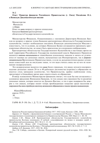 17. Финансовая политика и денежное обращение в Сибири. 1917-1920. Документы Исторического архива Омской области. Сб. док. / авт. сост. Д.И. Петин. Омск, 2014. EDN: IMIEON