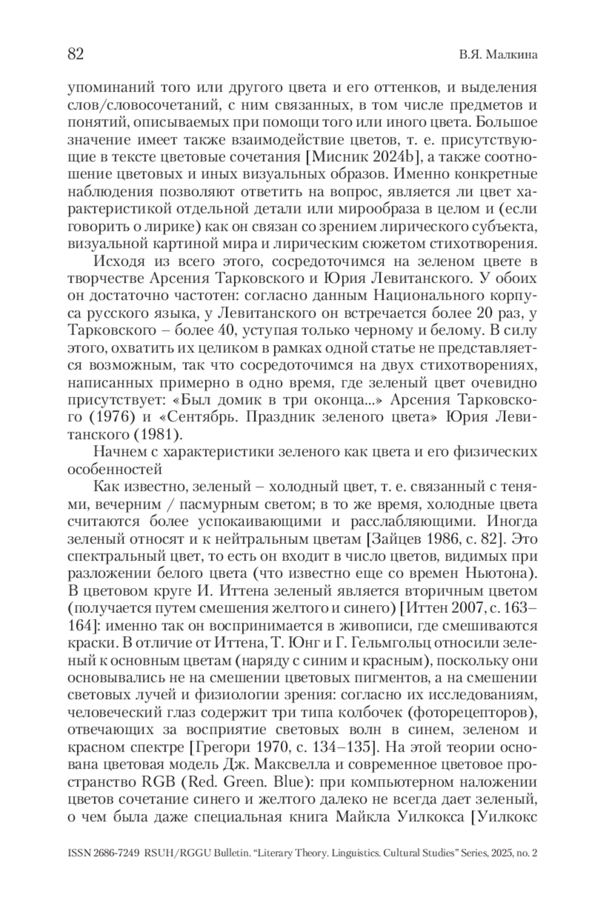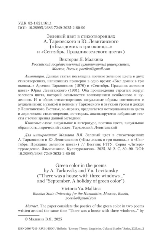 МАЛКИНА В. Я. ЗЕЛЕНЫЙ ЦВЕТ В СТИХОТВОРЕНИЯХ А. ТАРКОВСКОГО И Ю. ЛЕВИТАНСКОГО («БЫЛ ДОМИК В ТРИ ОКОНЦА…» И «СЕНТЯБРЬ. ПРАЗДНИК ЗЕЛЕНОГО ЦВЕТА») // ВЕСТНИК РГГУ. СЕРИЯ «ЛИТЕРАТУРОВЕДЕНИЕ. ЯЗЫКОЗНАНИЕ. КУЛЬТУРОЛОГИЯ». 2025. № 2