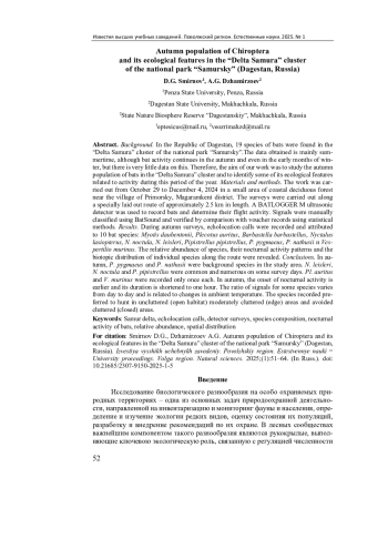 Актуальность и цели. В Республике Дагестан на территории кластера «Дельта Самура» национального парка «Самурский» предыдущими исследованиями установлено обитание 19 видов рукокрылых. Полученные сведения в основном относятся к летнему времени, тогда как активность рукокрылых продолжается и в осенние сроки и даже в первый месяц зимы, однако данных об этом крайне мало. В связи с этим целью нашей работы было изучение осеннего населения рукокрылых кластера «Дельта Самура» и выявление некоторых его экологических особенностей, связанных с активностью в этот период года. Материалы и методы. Работы проводили с 29 октября по 4 декабря 2024 г. на небольшом участке прибрежного лиственного леса, расположенном в окрестности с. Приморский Магарамкентского р-на. Учеты вели на специально заложенном маршруте, протяженностью около 2,5 км. Для регистрации рукокрылых и определения их полетной активности использовали ультразвуковой детектор BATLOGGER M. Классификацию сигналов проводили вручную с помощью BatSound, а верификацию путем сравнения с ваучерными записями статистическими методами. Результаты. В ходе осенних учетов были зарегистрированы эхолокационные сигналы, которые отнесены к 10 видам рукокрылых: Myotis daubentonii, Plecotus auritus, Barbastella barbastellus, Nyctalus lasiopterus, N. noctula, N. leisleri, Pipistrellus pipistrellus, P. pygmaeus, P. Nathusii и Vespertilio murinus. Выявлены относительное обилие видов, характер их ночной активности и биотопическое распределение отдельных видов на маршруте. Выводы. Осенью в районе проведения работ фоновыми видами являлись P. pygmaeus и P. nathusii. Обычными, а в некоторые дни учетов и многочисленными были N. leisleri, N. noctula и P. pipistrellus. Лишь по одной записи сделано Pl. auritus и V. murinus. Осенью начало ночной активности сдвинуто на более раннее время, а ее продолжительность сокращена в среднем до двух часов. Численное соотношение сигналов у некоторых видов менялось по дням и было связано с изменениями температуры окружающей среды. В биотопическом отношении зарегистрированные виды предпочитали охотиться на открытых и полуоткрытых пространствах и избегали закрытых.