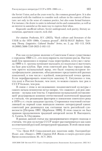 Цель статьи – прояснить социокультурные связи между участниками рок-сообщества (музыкантами, фанатами, журналистами) и представителями литературного процесса (поэтами, писателями, критиками) в позднем СССР. Некоторая общность между этими группами присутствовала с самого начала распространения рока в Советском Союзе, и с годами точек соприкосновения становилось все больше. C этим связана традиция рассматривать рок-культуру в контексте литературы: не только в смысле общей поэтики, но и формальных признаков. Среди них – стремление объединяться в неформальные кружки и сообщества, а также интерес к самиздату как основному способу трансляции своих идей.