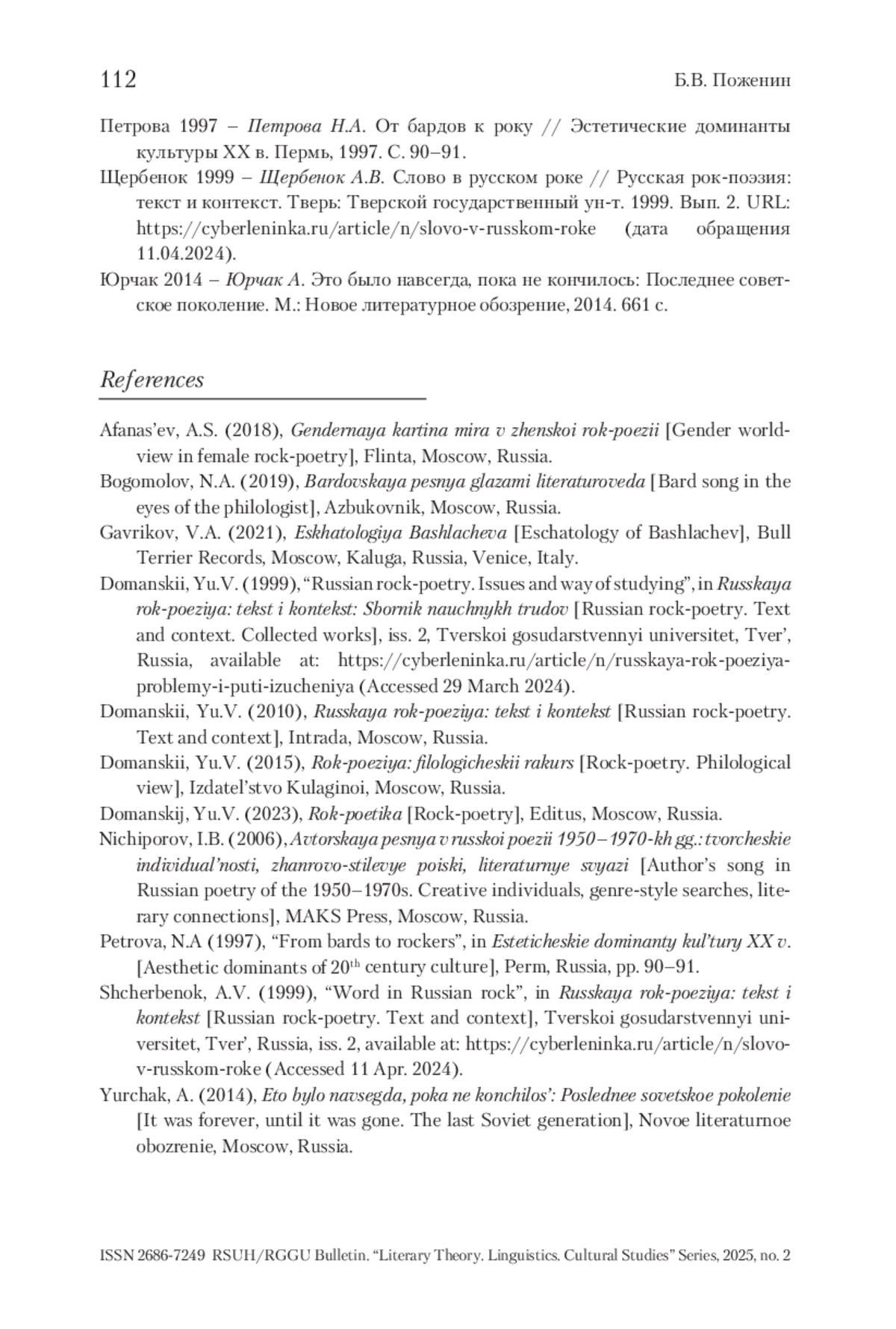 4. Доманский 1999 - Доманский Ю.В. Русская рок-поэзия: проблемы и пути изучения // Русская рок-поэзия: текст и контекст: Сб. науч. трудов. Тверь: Тверской государственный ун-т, 1999. Вып. 2. URL: https://cyberleninka.ru/article/n/russkaya-rok-poeziya-problemy-i-puti-izucheniya (дата обращения 29.03.2024). Доманский 2010 -