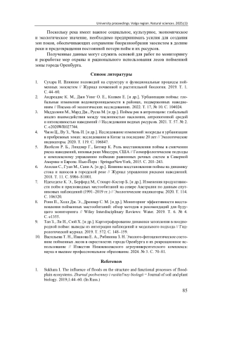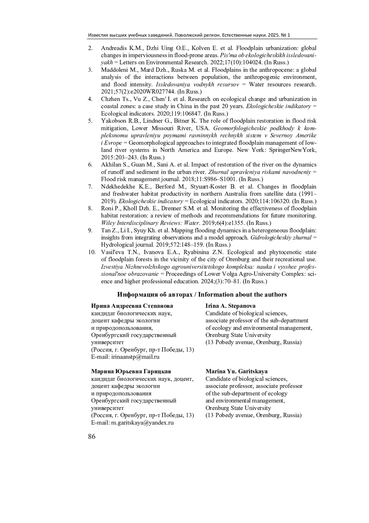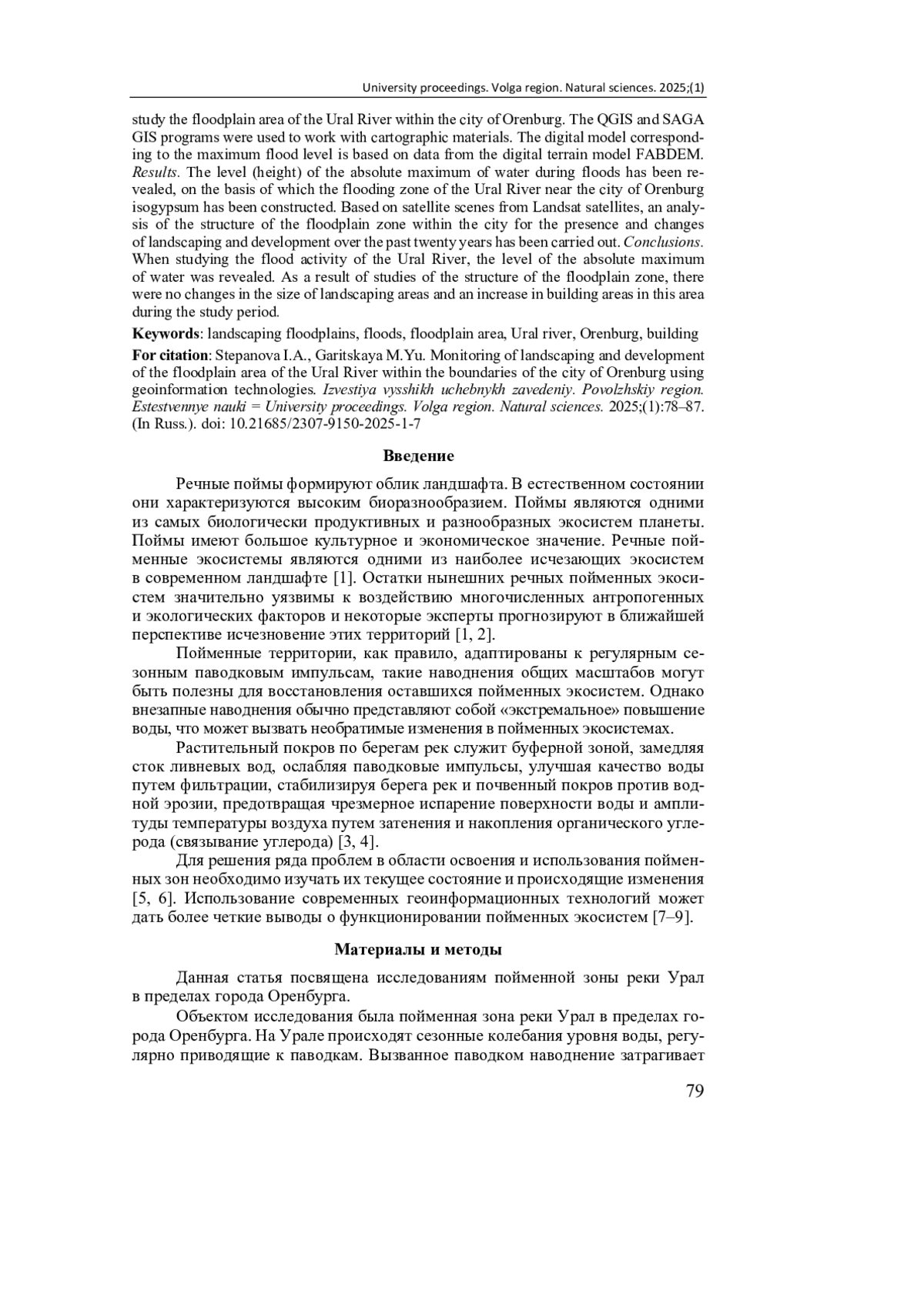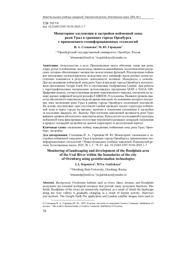 СТЕПАНОВА И. А., ГАРИЦКАЯ М. Ю. МОНИТОРИНГ ОЗЕЛЕНЕНИЯ И ЗАСТРОЙКИ ПОЙМЕННОЙ ЗОНЫ РЕКИ УРАЛ В ГРАНИЦАХ ГОРОДА ОРЕНБУРГА С ПРИМЕНЕНИЕМ ГЕОИНФОРМАЦИОННЫХ ТЕХНОЛОГИЙ // ИЗВЕСТИЯ ВЫСШИХ УЧЕБНЫХ ЗАВЕДЕНИЙ. ПОВОЛЖСКИЙ РЕГИОН. ЕСТЕСТВЕННЫЕ НАУКИ. 2025. № 1 (49)