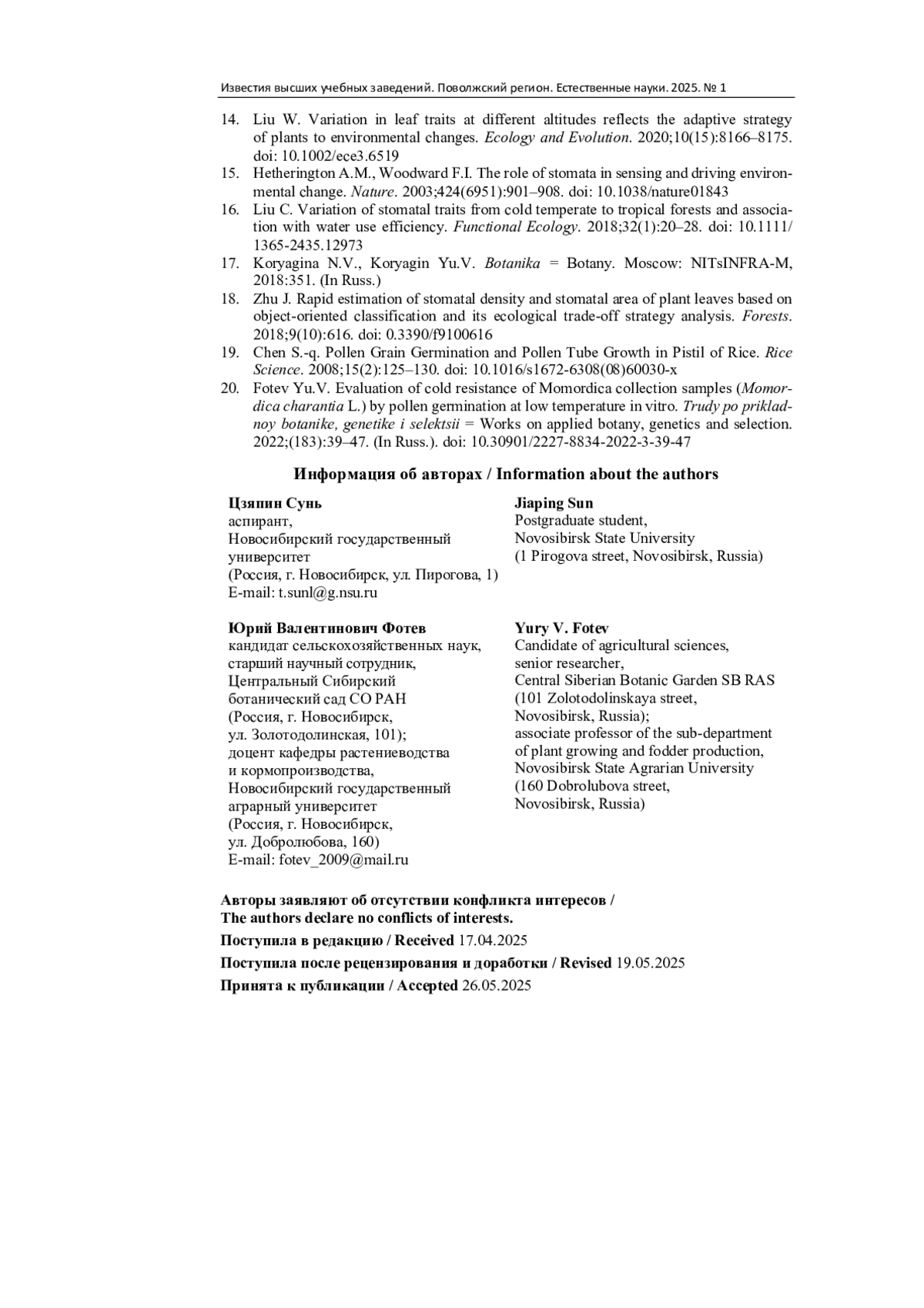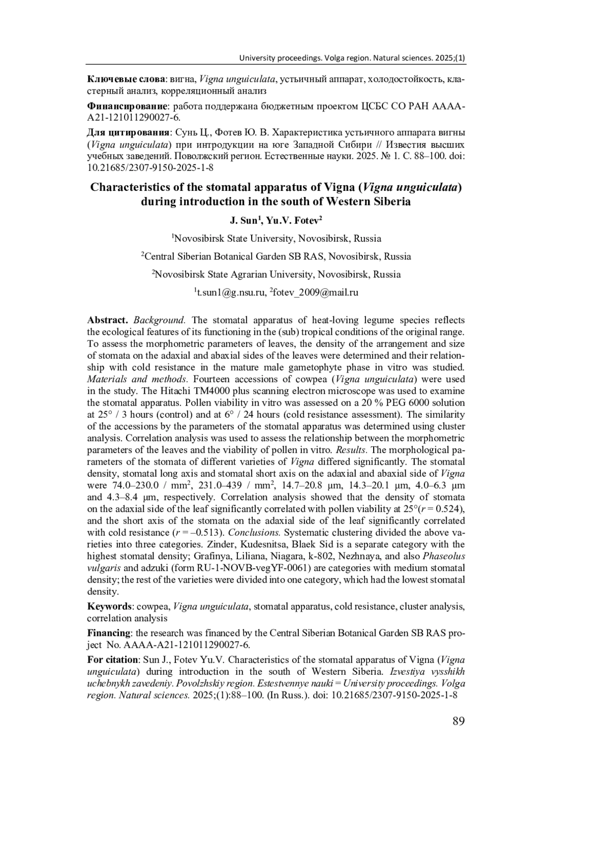 ЦЗЯПИН С., ФОТЕВ Ю. В. ХАРАКТЕРИСТИКА УСТЬИЧНОГО АППАРАТА ВИГНЫ (VIGNA UNGUICULATA) ПРИ ИНТРОДУКЦИИ НА ЮГЕ ЗАПАДНОЙ СИБИРИ // ИЗВЕСТИЯ ВЫСШИХ УЧЕБНЫХ ЗАВЕДЕНИЙ. ПОВОЛЖСКИЙ РЕГИОН. ЕСТЕСТВЕННЫЕ НАУКИ. 2025. № 1 (49)