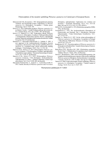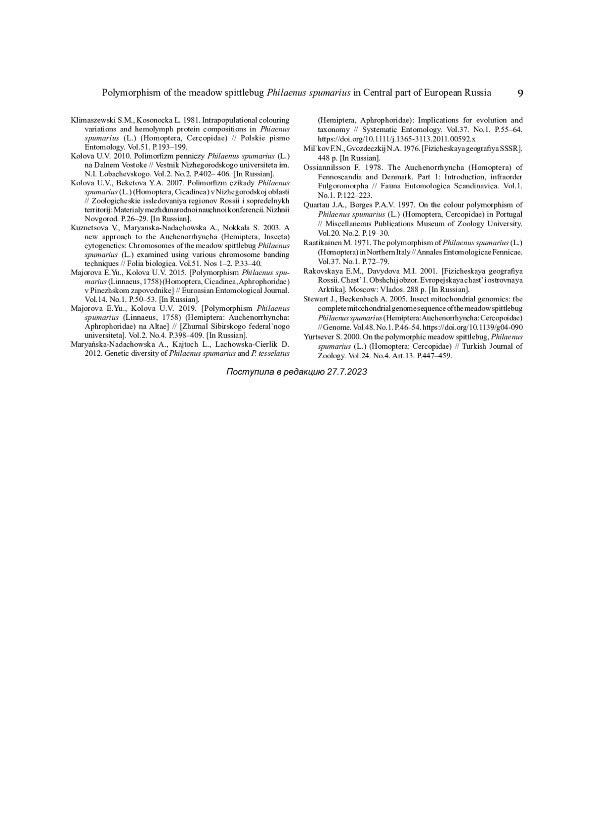 9. Guseva A.D., Kolova U.V. 2022. [Polimorfizm Philaenus spumarius (L.) (Auchenorrhyncha: Aphrophoridae) v czentre Vostochno-Evropejskoj ravniny’] // [Biosistemy’: organizacziya, povedenie, upravlenie: Tezisy’ dokladov 75-j Vserossijskoj s mezhdunarodny’m uchastiem shkoly’-konferenczii molody’kh ucheny’kh]. Nizhnii Novgorod 19-22 Apil 2022. P.57. [In Russian].