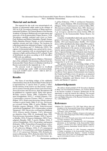 5. Yavorskaya N.M., Bobrovsky V.V. 2023. Taxonomic composition of benthic invertebrates of the Komsomolskii Nature Reserve watercourses (Khabarovsky Region) // Amurian Zoological Journal. Vol.XV. No.3. P.657-678. [In Russian]. https://www.