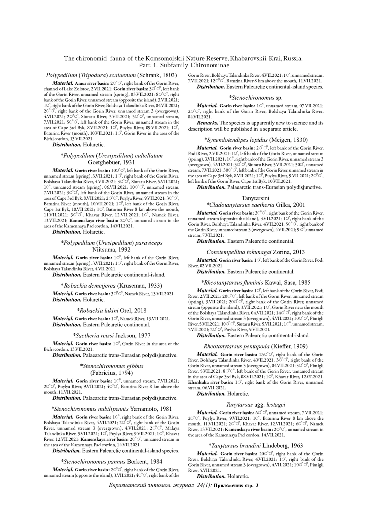 Data on the Chironominae fauna of the Komsomolskii Nature Reserve are presented in the form of an annotated list of species based on the study of imaginal material. The rivers and reservoirs of the reserve support 57 species of 27 genera and 2 tribes. During this study, 3 new species were discovered from the genera Demicryptochironomus Lenz, 1941, Stenochironomus Kieff er, 1919 and Tanytarsus van der Wulp, 1874, 39 species were reported for the fi rst time for the Komsomolskii Nature Reserve. Most of the 49 identifi ed species (28 or 57 %) have a Palaearctic distribution and 21 species or 43 % have a Holarctic distribution. The greatest diversity of non-biting midges of the subfamily Chironominae was recorded in an unnamed stream on the left bank of the Gorin River — 29 species, in the Gorin River — 23 species, and in the Baturina River — 19 species.
