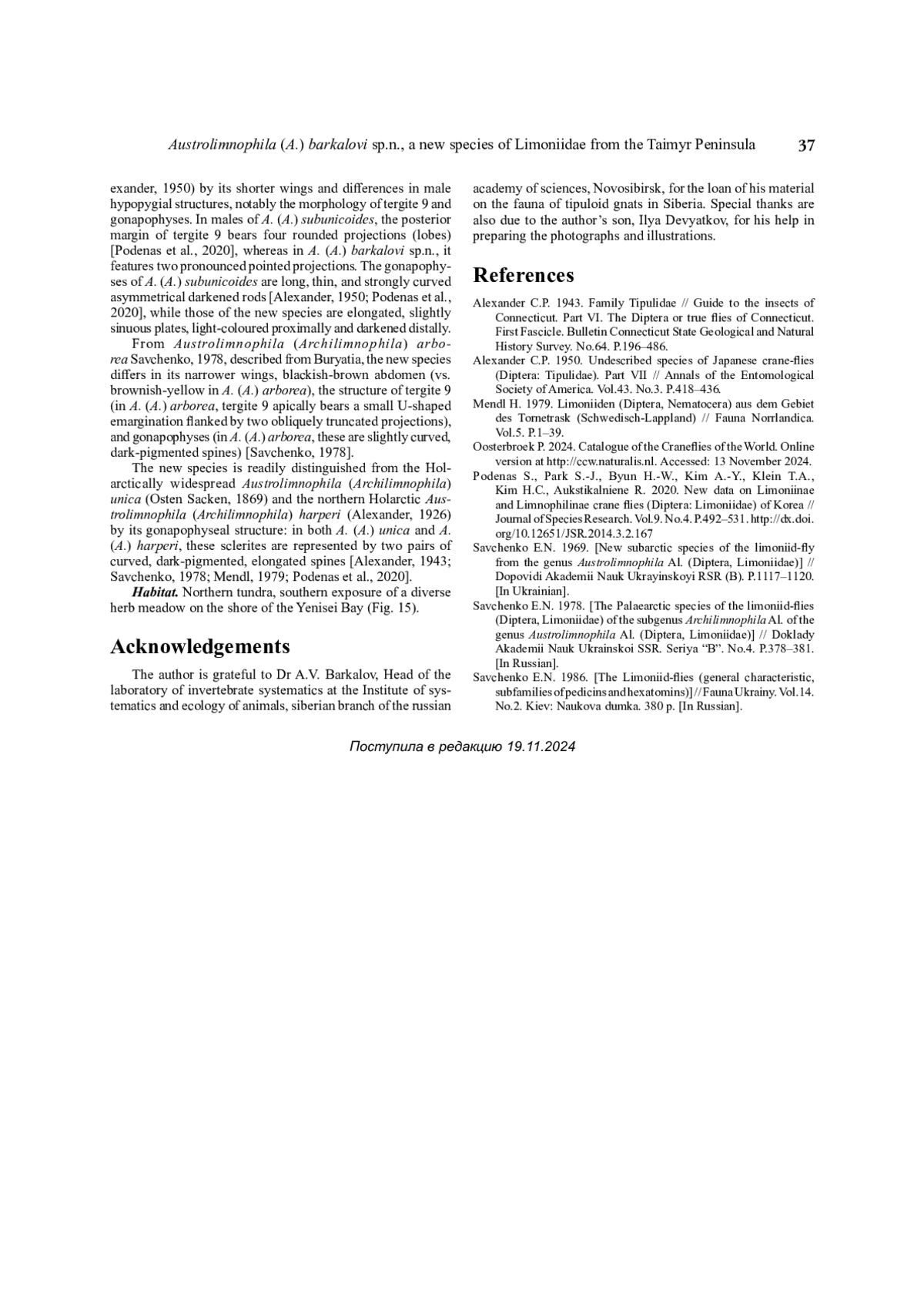 6. Savchenko E.N. 1969. [New subarctic species of the limoniid-fly from the genus Austrolimnophila Al. (Diptera, Limoniidae)] // Dopovidi Akademii Nauk Ukrayinskoyi RSR (B). P.1117-1120. [In Ukrainian].