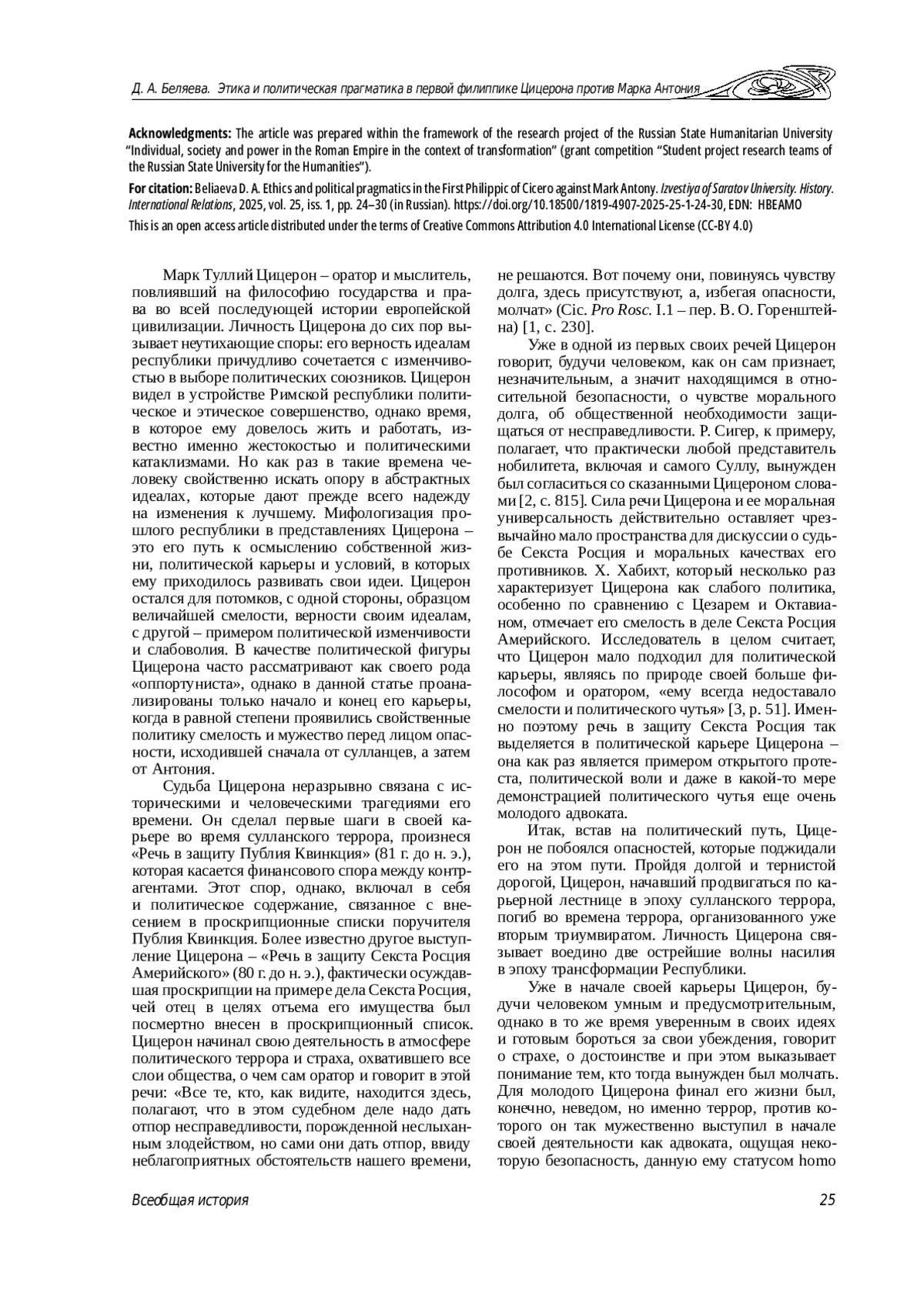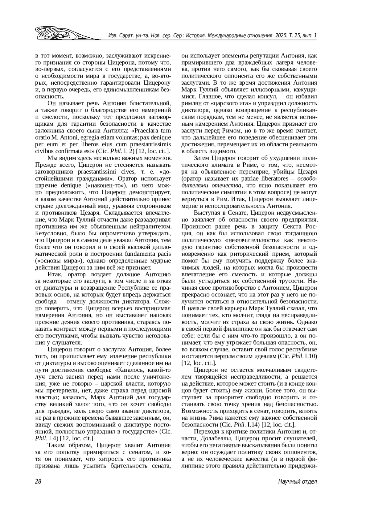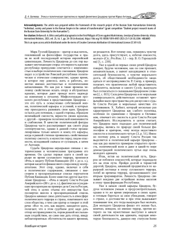 В статье рассматривается первая филиппика против Марка Антония в качестве источника, который раскрывает как определенные биографические обстоятельства в жизни Цицерона, так и его представления и идеалы, связанные с поведением политика. Анализ первой филиппики как политического действия, подобного тому, которое Цицерон совершил в начале своей карьеры, защищая в суде Секста Росция Америйского, позволяет рассмотреть его взаимоотношения с Марком Антонием в динамике и определить, каким образом филиппики как реальное политическое действие соотносятся с представлениями о политике, транслировавшимися Цицероном.