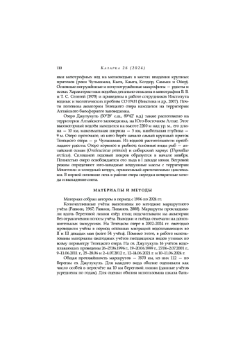 Исследования проводились вдоль берегов Телецкого озера (434 м над уровнем моря, общая протяжённость маршрута исследования — 3858 км) ежегодно в мае и июне с 2002 по 2024 год, а также на озере Джулукуль (2200 м над уровнем моря, 112 км) в июне 1996, 1999, 2001, 2011, 2012 и 2024 годов. На Телецком озере и в его непосредственной близости от него встречено восемнадцать видов гусеобразных: лебедь-кликун (Cygnus cygnus ), Белый гусь ( Anser fabalis ), Белолобый гусь ( A. albifrons ), красноперка ( Tadorna ferruginea ), свиристель ( Anas penelope ), овод ( A. strepera), Обыкновенный чирок ( A. crecca ), Кряква ( A. platyrhynchos ), Острохвостка ( A. acuta ), Гарганея ( A. querquedula ), Лопатонос ( A. clypeata ), Обыкновенный подосиновик ( Aythya ferina ), Хохлатая утка ( A. fuligula ), Белокрылый шотландец ( Melanitta deglandi ), длиннохвостая утка ( Clangula hyemalis ), Золотарник ( Bucephala clangula ), Смью (Mergellus albellus ) и гусиный пух (Mergus merganser ). Кряква, красноголовый нырок и красноголовый нырок-крошка были самыми распространёнными видами, гнездящимися на озере. Большой крохаль и белокрылый нырок гнездились в очень небольшом количестве и не каждый год. На озере Джулукуль обитало 13 видов водоплавающих птиц, таких же, как и на Телецком озере, за исключением белощёкой казарки, белолобого гуся, красноголового нырка, длиннохвостой утки и свиязи. Здесь гнездились лебедь-кликун, пеганка, свиязь, шилохвость, хохлатая чернеть и белокрылый нырок. Большое количество свиязей и гоголей летом (в среднем за все годы: 15 и 13 особей на 10 км береговой линии соответственно) объясняется большими скоплениями самцов в период линьки.