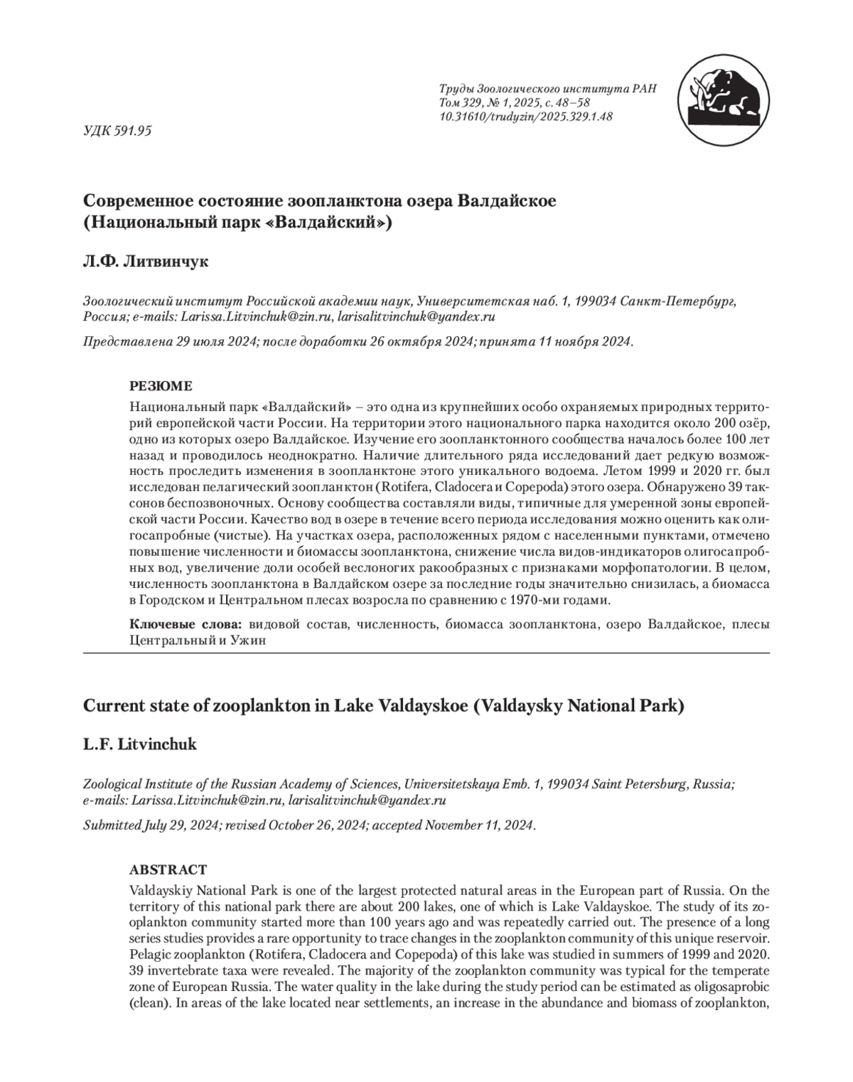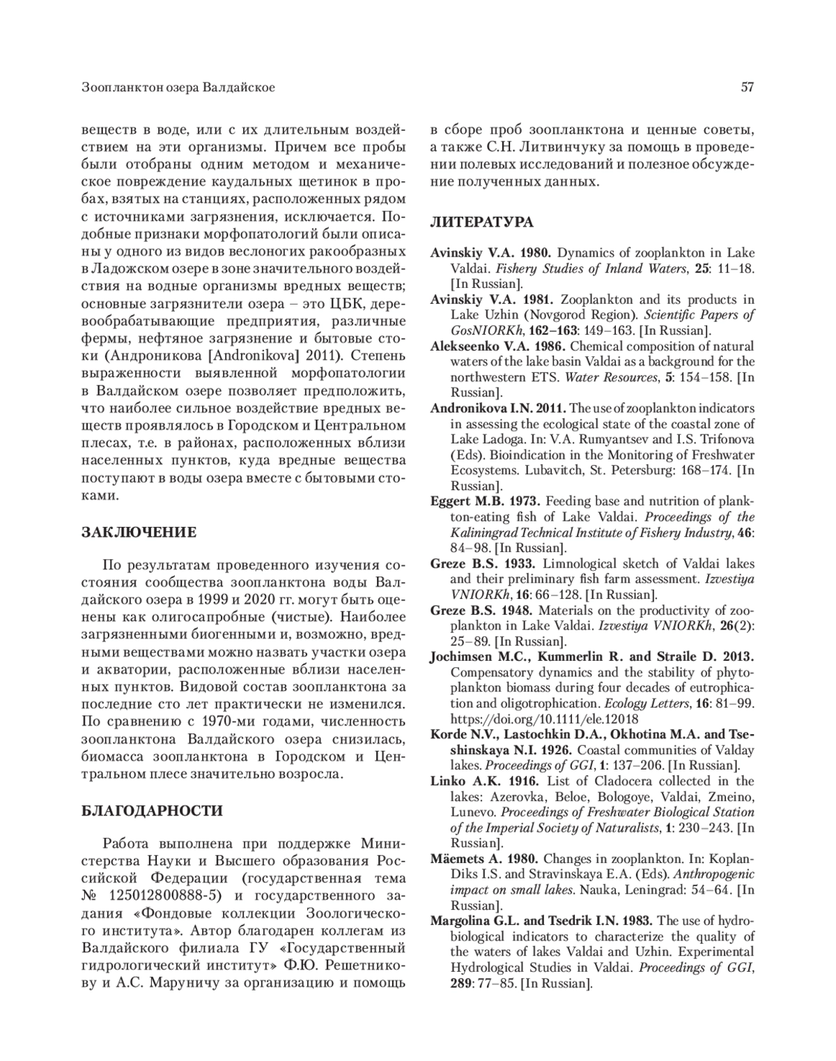 1. Avinskiy V.A. 1980. Dynamics of zooplankton in Lake Valdai. Fishery Studies of Inland Waters, 25: 11-18. [In Russian].