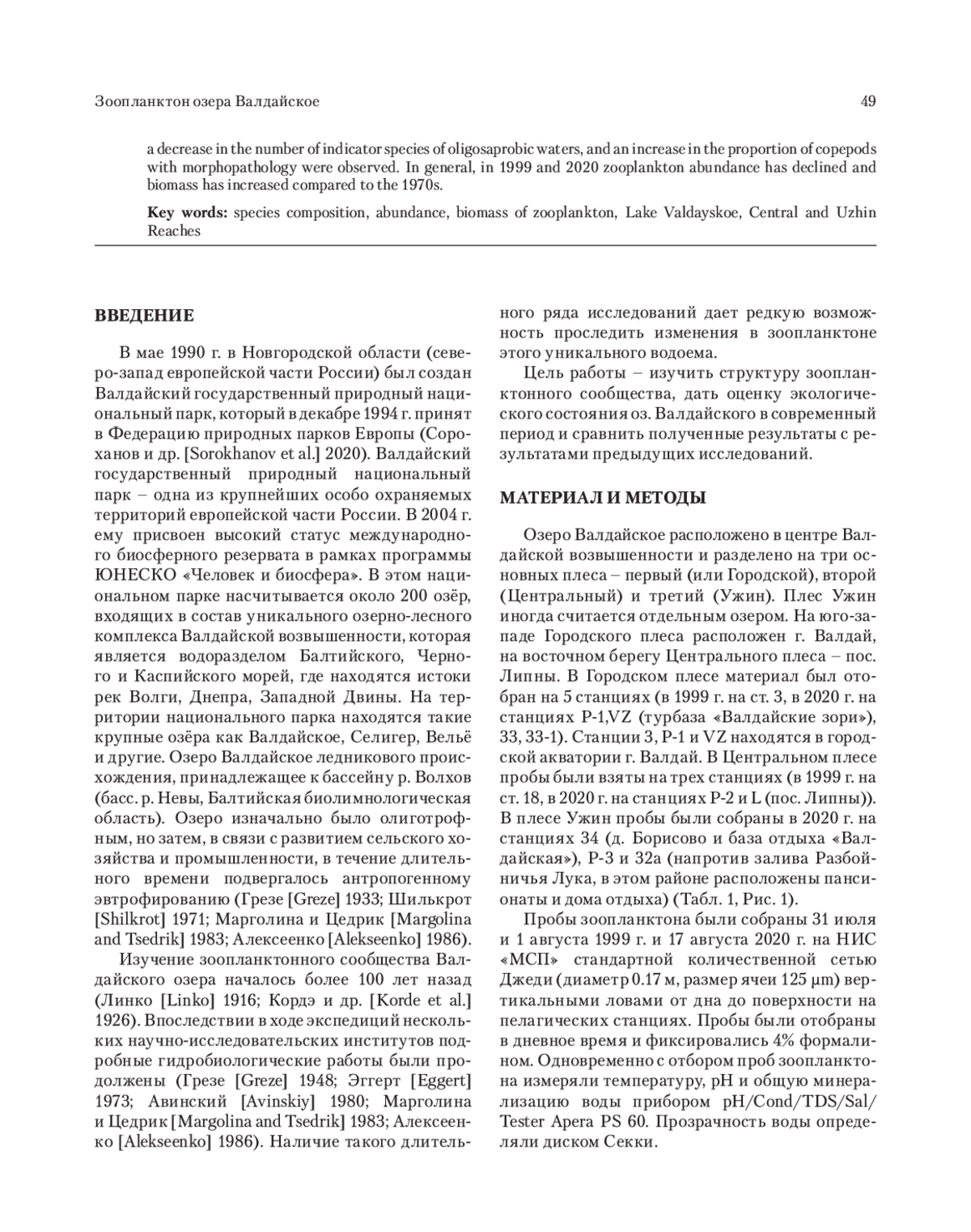 12. Margolina G.L. and Tsedrik I.N. 1983. The use of hydrobiological indicators to characterize the quality of the waters of lakes Valdai and Uzhin. Experimental Hydrological Studies in Valdai. Proceedings of GGI, 289: 77-85. [In Russian].