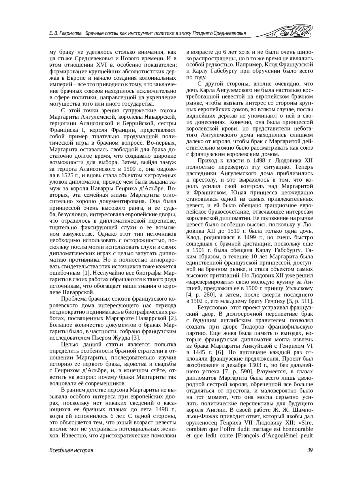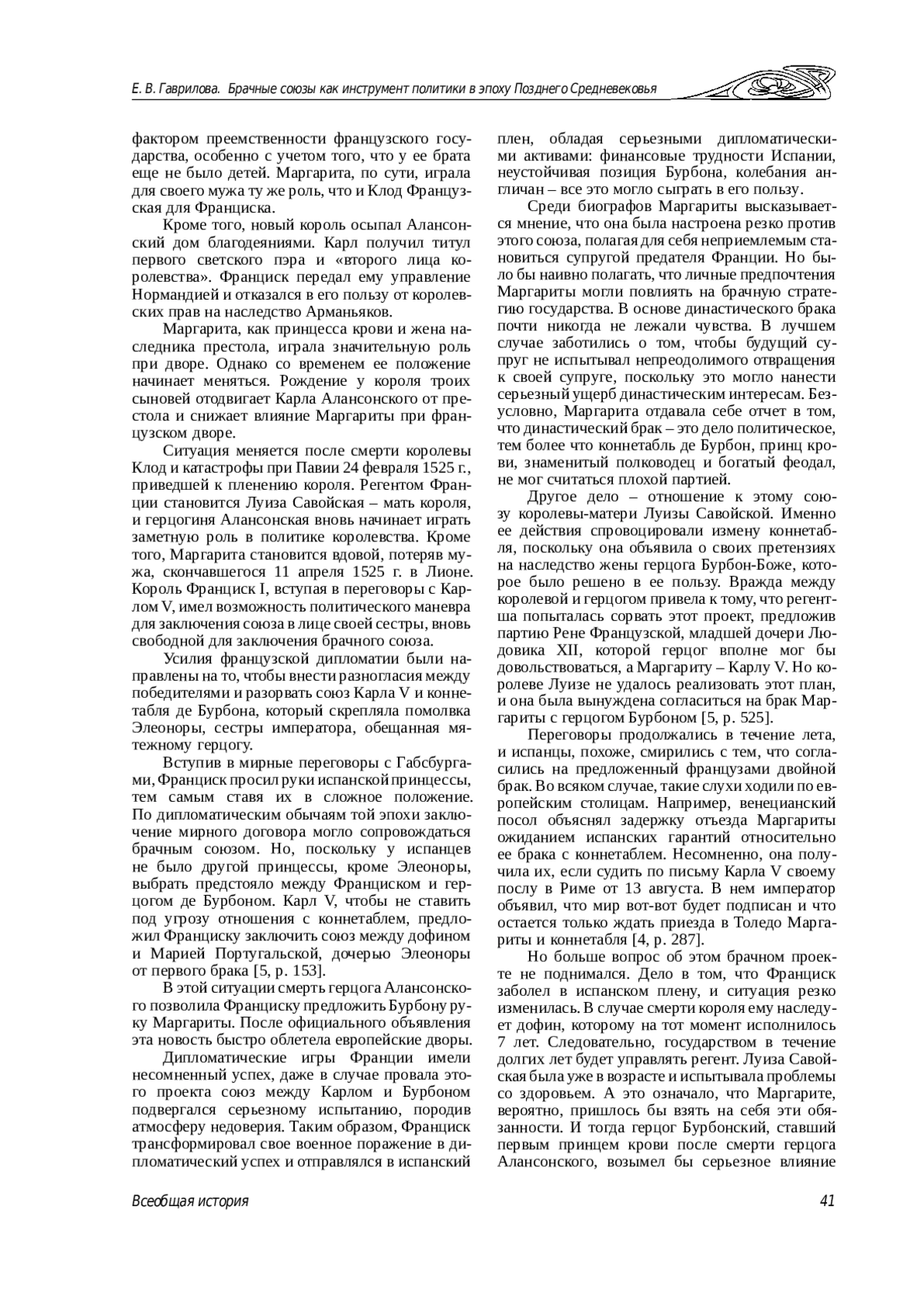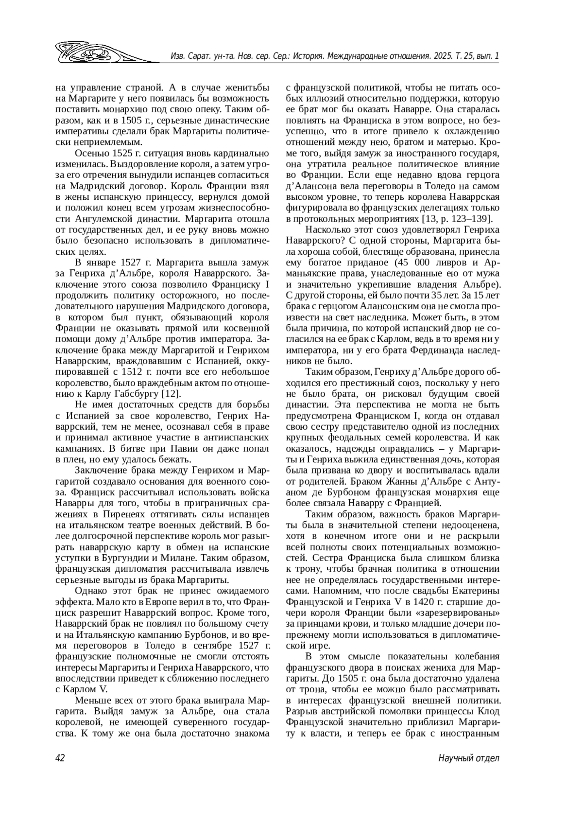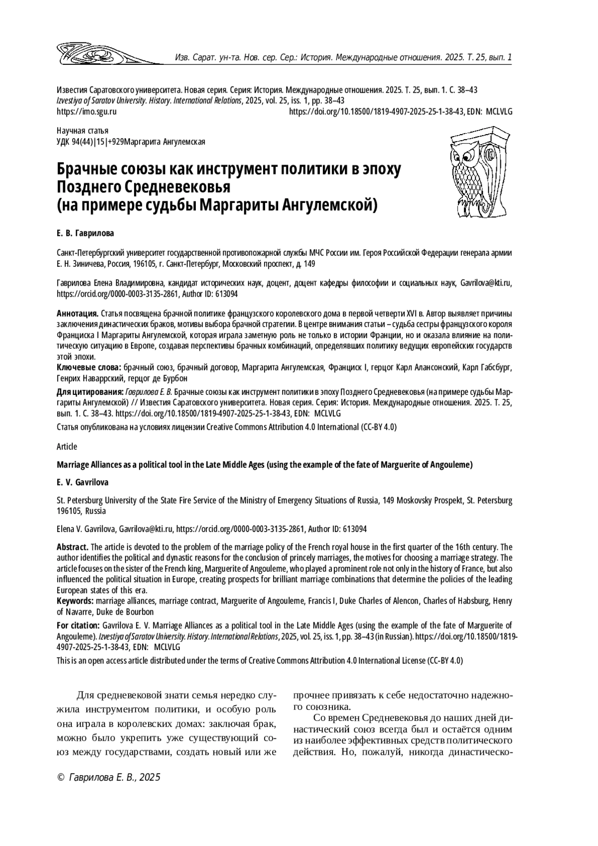 ГАВРИЛОВА Е. В. БРАЧНЫЕ СОЮЗЫ КАК ИНСТРУМЕНТ ПОЛИТИКИ В ЭПОХУ ПОЗДНЕГО СРЕДНЕВЕКОВЬЯ (НА ПРИМЕРЕ СУДЬБЫ МАРГАРИТЫ АНГУЛЕМСКОЙ) // ИЗВЕСТИЯ САРАТОВСКОГО УНИВЕРСИТЕТА. НОВАЯ СЕРИЯ. СЕРИЯ: ИСТОРИЯ. МЕЖДУНАРОДНЫЕ ОТНОШЕНИЯ. 2025. Т. 25 № 1