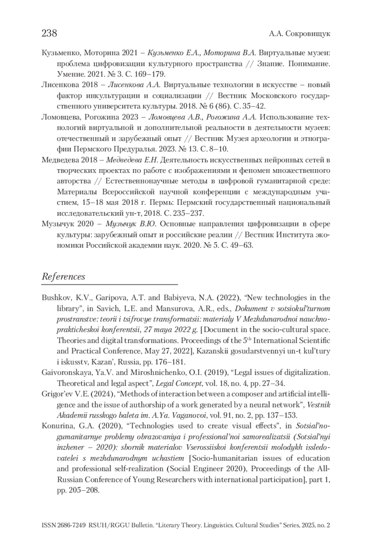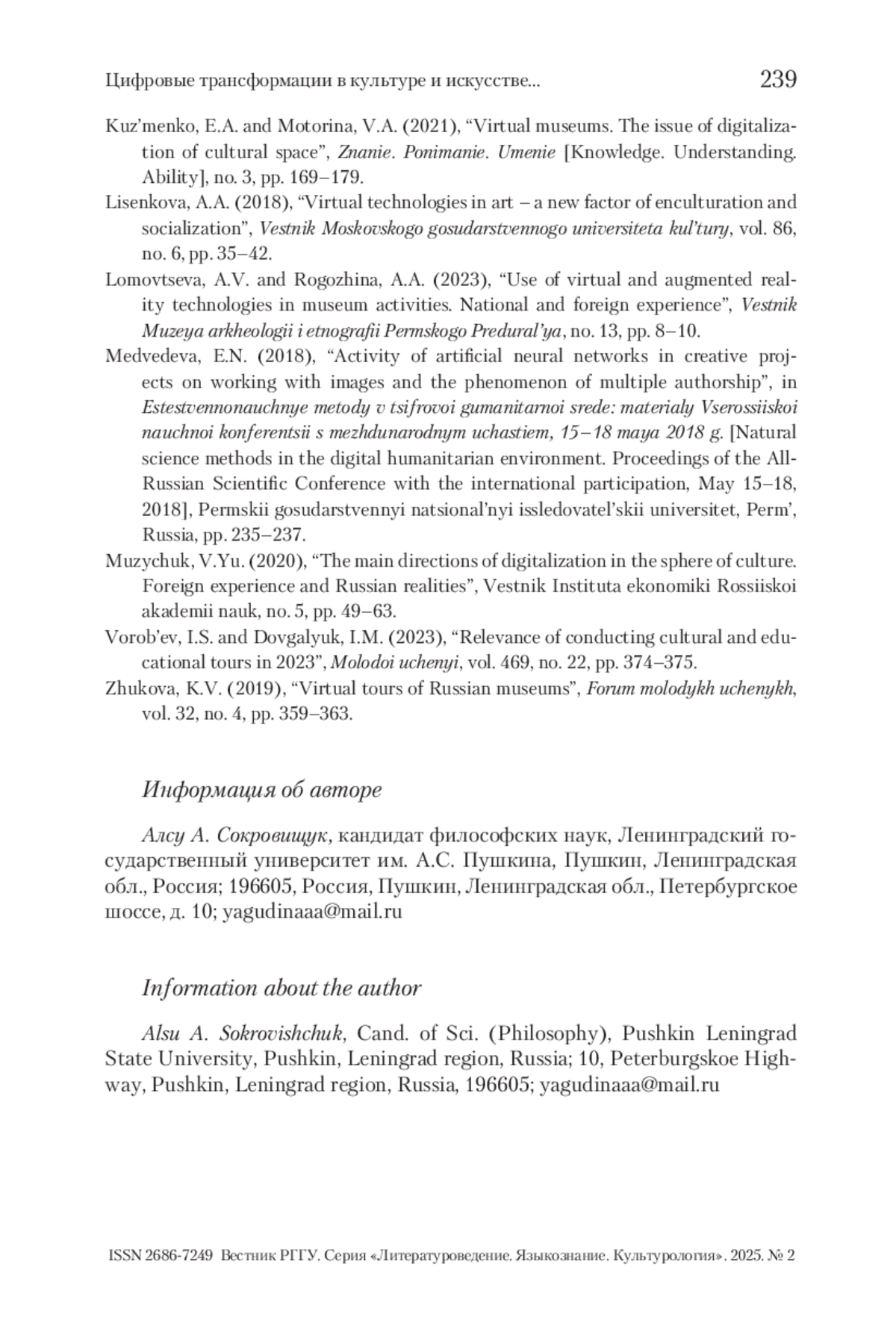 СОКРОВИЩУК А. А. ЦИФРОВЫЕ ТРАНСФОРМАЦИИ В КУЛЬТУРЕ И ИСКУССТВЕ: СОВРЕМЕННЫЕ РЕАЛИИ // ВЕСТНИК РГГУ. СЕРИЯ «ЛИТЕРАТУРОВЕДЕНИЕ. ЯЗЫКОЗНАНИЕ. КУЛЬТУРОЛОГИЯ». 2025. № 2