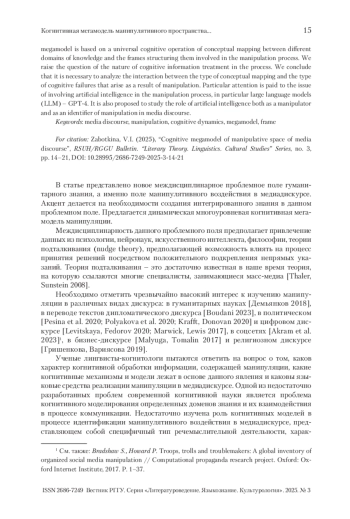 5. Заботкина, Позднякова 2024 - Заботкина В.И., Позднякова Е.М. Когнитивно-коммуникативная динамика манипулирования в медиа // Вопросы когнитивной лингвистики. 2024. № 4. С. 124-134.