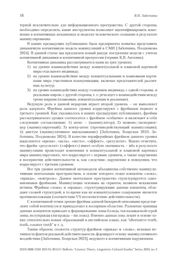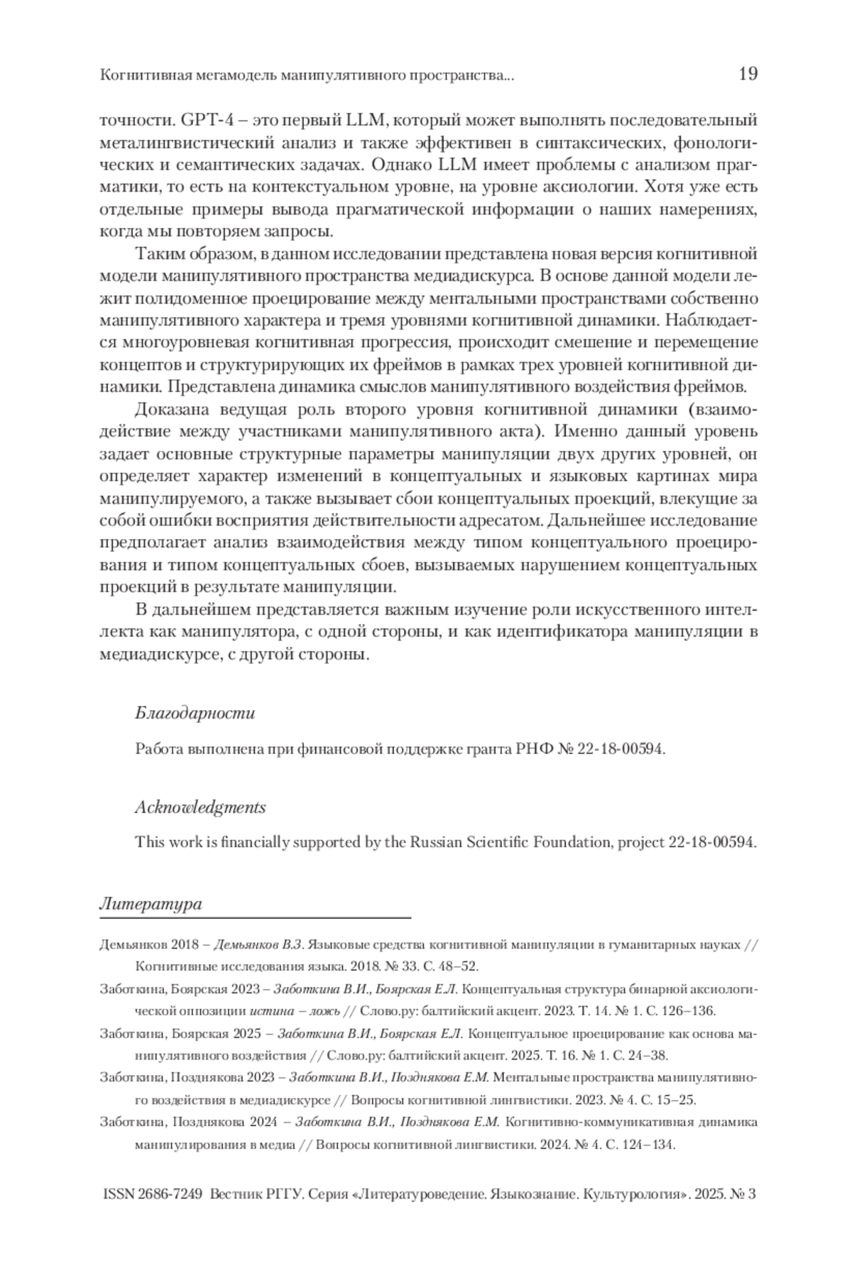 3. Заботкина, Боярская 2025 - Заботкина В.И., Боярская Е.Л. Концептуальное проецирование как основа манипулятивного воздействия // Слово.ру: балтийский акцент. 2025. Т. 16. № 1. С. 24-38.
