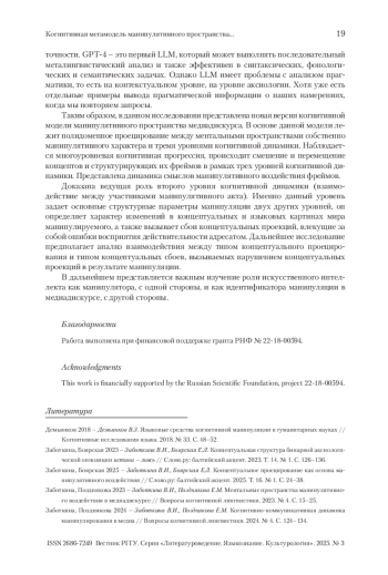 4. Заботкина, Позднякова 2023 - Заботкина В.И., Позднякова Е.М. Ментальные пространства манипулятивного воздействия в медиадискурсе // Вопросы когнитивной лингвистики. 2023. № 4. С. 15-25.