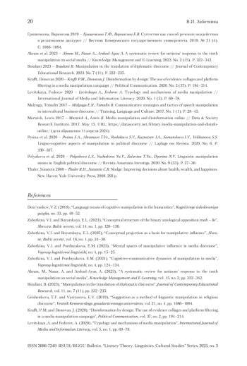 13. Pesina et al. 2020 - Pesina S.A., Abramzon T.Ye., Rudakova S.V., Kuznetsov I.A., Samarokova I.V., Velikanova S.S. Linguo-cognitive aspects of manipulation in political discourse // Laplage em Revista. 2020. No. 6. P. 330-337.