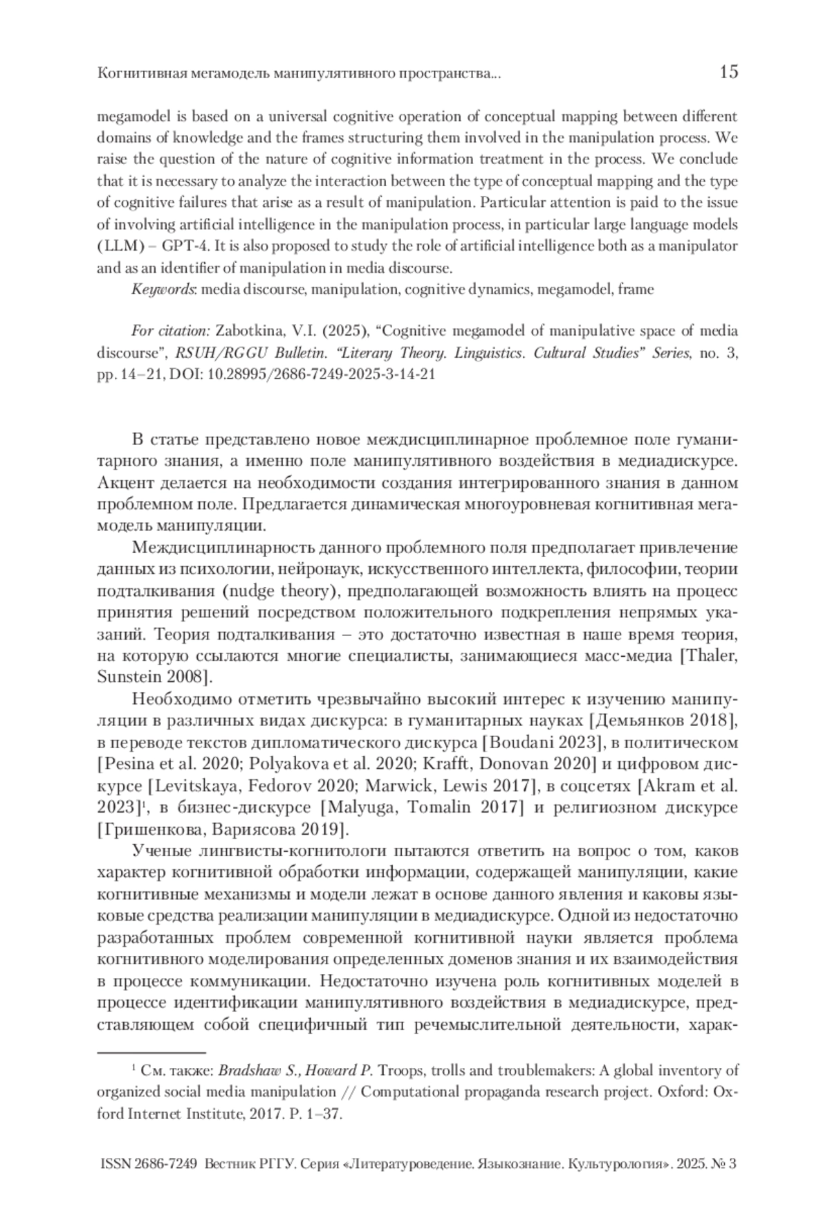 В статье представлено новое междисциплинарное проблемное поле гуманитарного знания, а именно поле манипулятивного воздействия в медиадискурсе. Акцент делается на необходимости создания интегрированного знания в данном проблемном поле. Предлагается динамическая многоуровневая когнитивная мегамодель манипуляции, которая представлена на трех уровнях когнитивной динамики. Привлекаются данные из психологии, нейронаук, искусственного интеллекта, теории подталкивания. В основе многоуровневой мегамодели лежит универсальная когнитивная операция концептуального проецирования между различными доменами знания и структурирующими их фреймами, вовлеченными в процесс манипуляции. Мы ставим вопрос о том, каков характер когнитивной обработки информации в данном процессе. Мы приходим к заключению о необходимости анализа взаимодействия между типом концептуального проецирования и типом когнитивных сбоев, возникающих в результате манипуляции. Особое внимание в статье уделяется вопросу вовлечения в процесс манипуляции искусственного интеллекта и, в частности, больших языковых моделей (LLM) – GPT-4. Предлагается также изучить роль искусственного интеллекта как манипулятора и как идентификатора манипуляции в медиадискурсе.