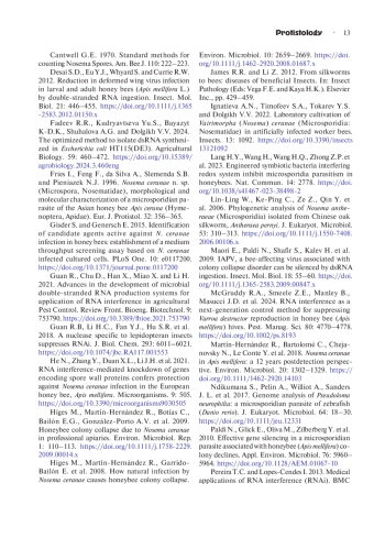 23. Paldi N., Glick E., Oliva M., Zilberberg Y. et al. 2010. Effective gene silencing in a microsporidian parasite associated with honeybee (Apis mellifera) colony declines. Appl. Environ. Microbiol. 76: 5960- 5964. DOI: 10.1128/AEM.01067-10