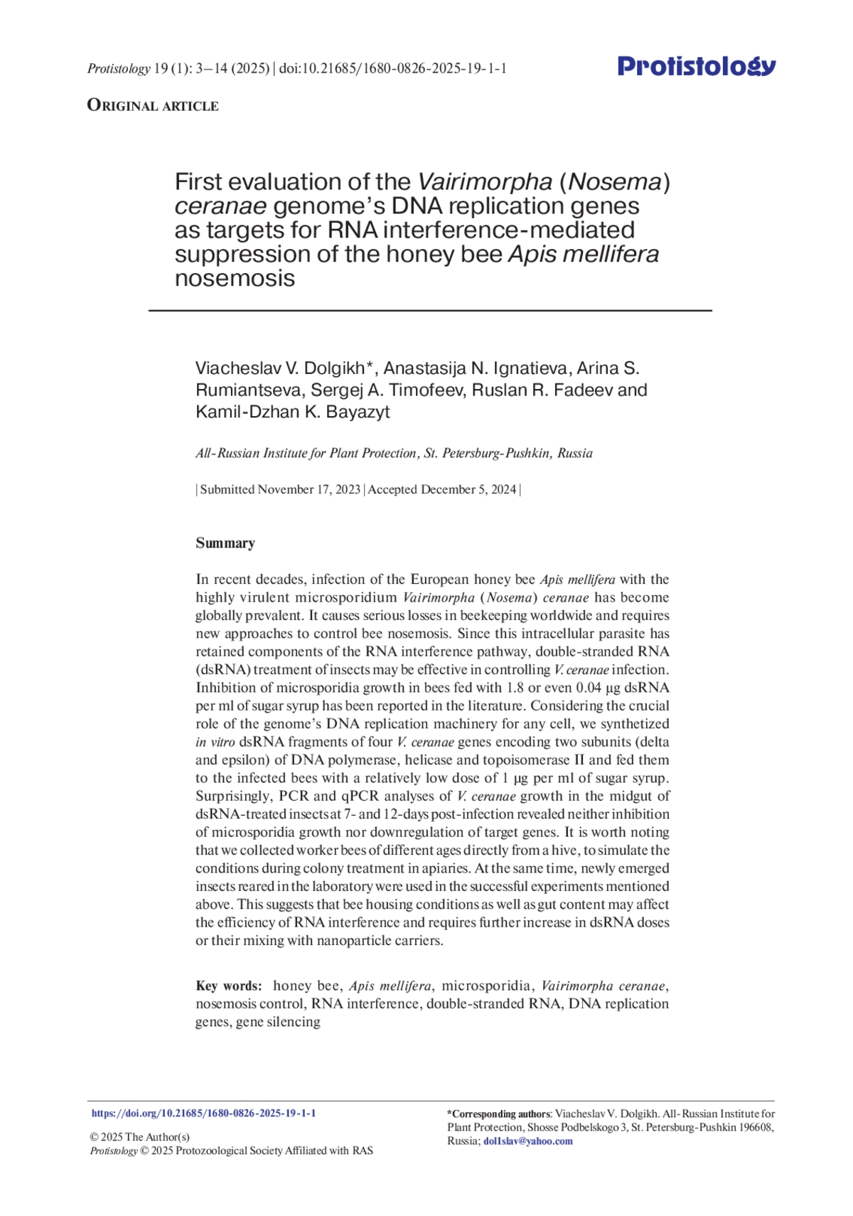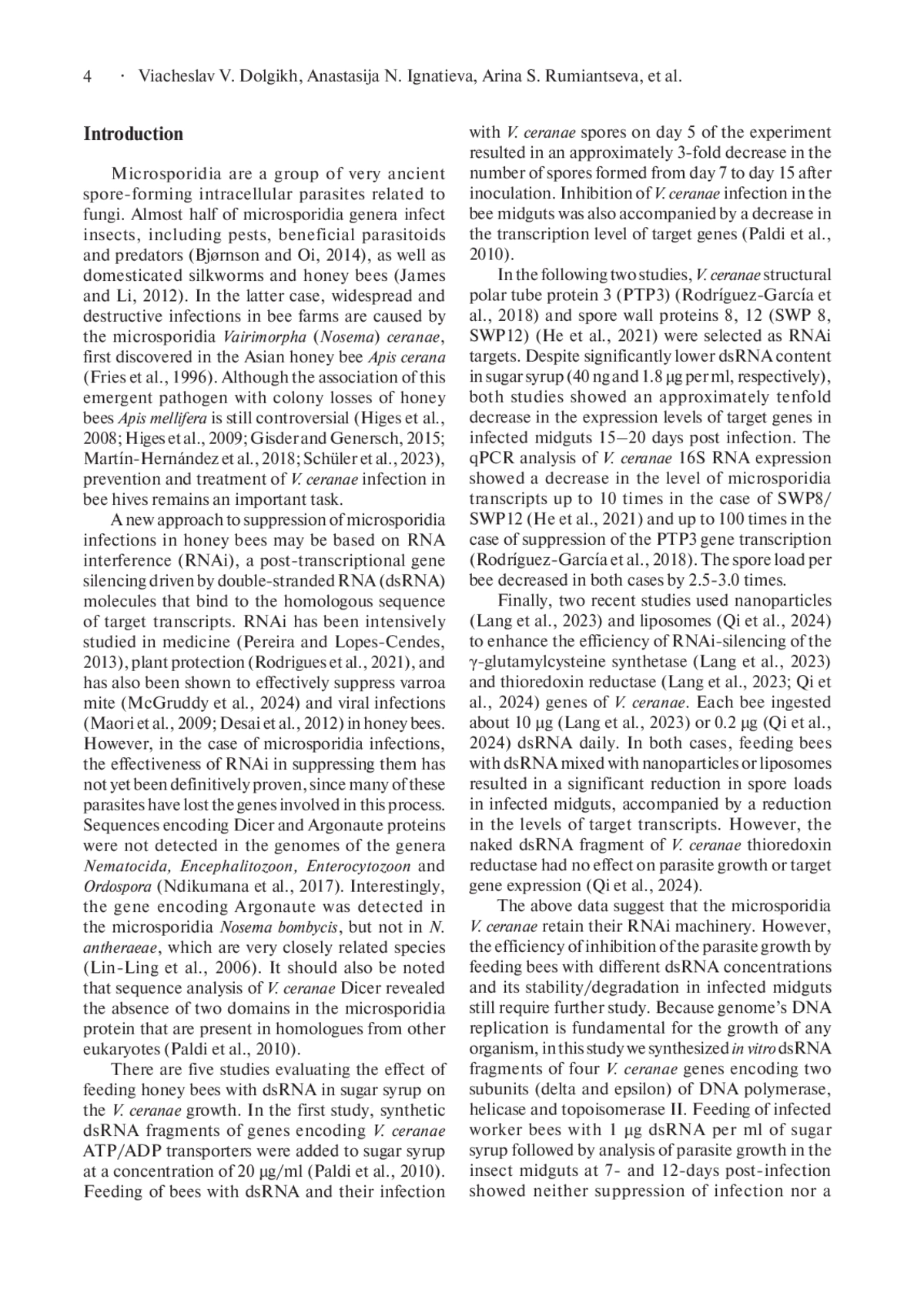 25. Qi Y., Wang C., Lang H., Wang Y. et al. 2024. Liposome-based RNAi delivery in honeybee for inhibiting parasite Nosema ceranae. Synth. Syst. Biotechnol. 9: 853-860. DOI: 10.1016/j.synbio.2024.07.003