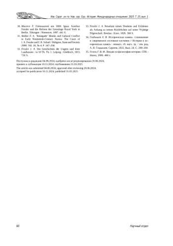 31. Walker F. A. ‘Renegade’ Monks and Cultural Conflict in Early Nineteenth-Century Russia: The Cases of I. A. Fessler and J. B. Schad // Religion, State and Society. 2000. Vol. 28, № 4. Р. 347-358.