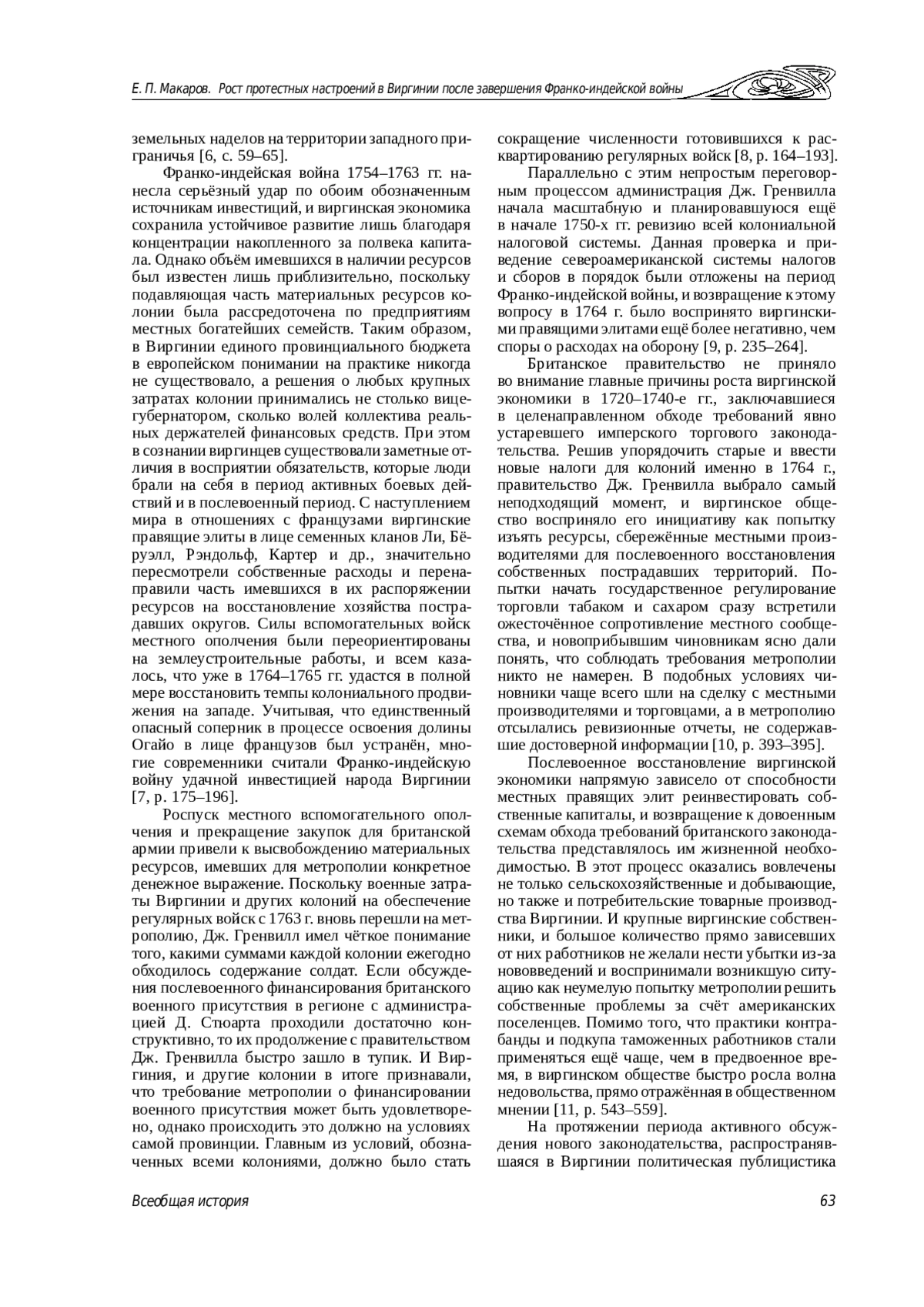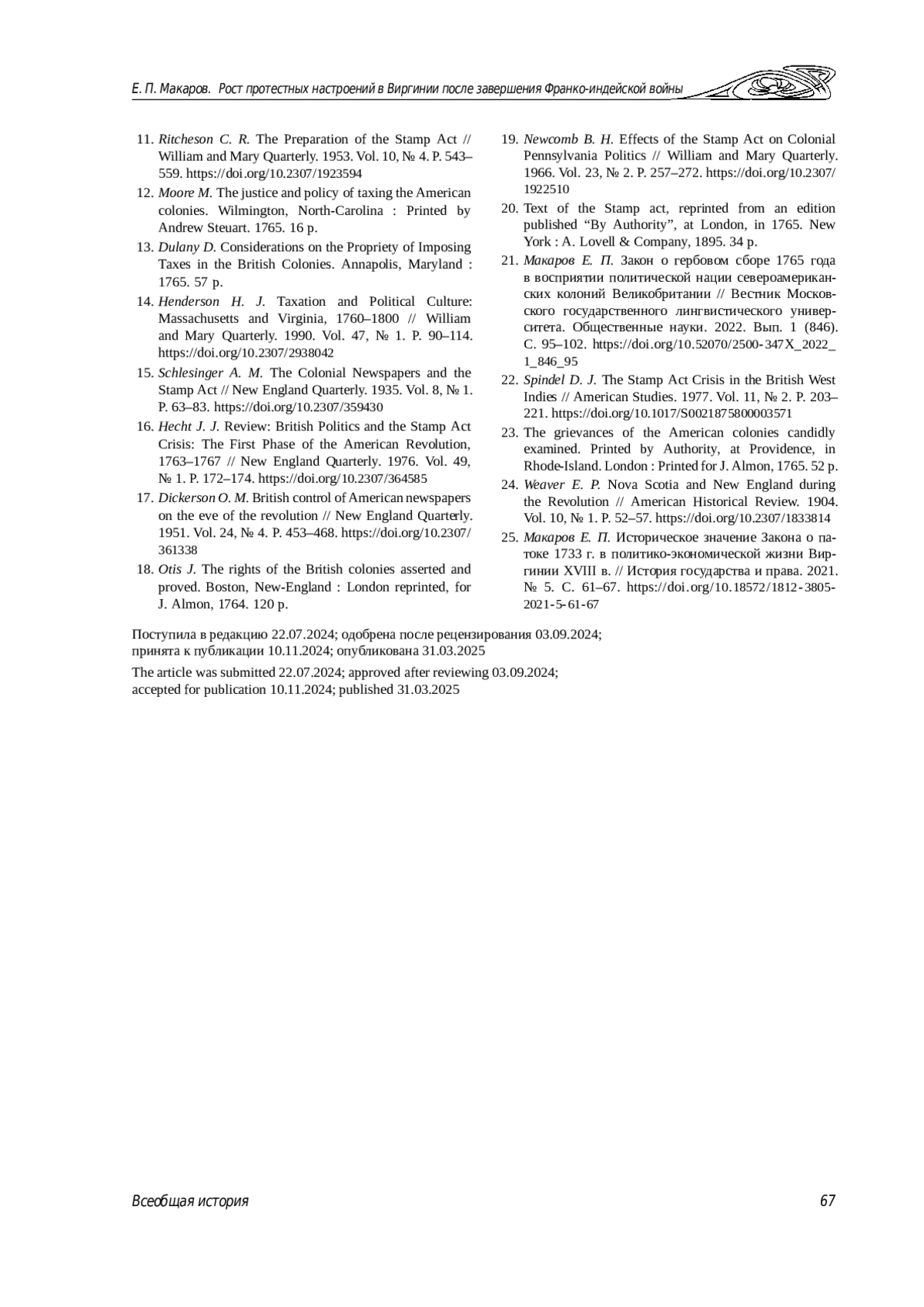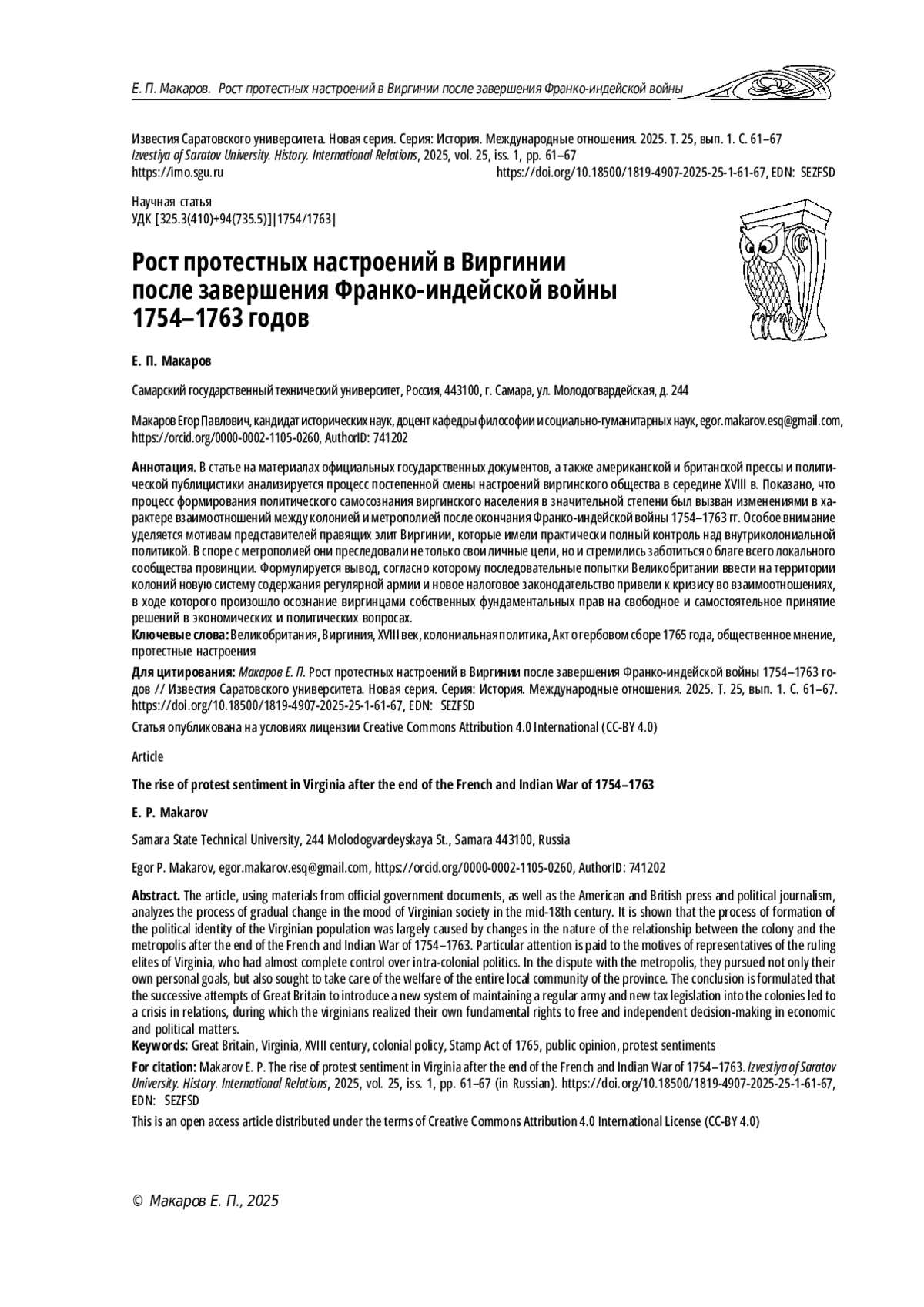 МАКАРОВ Е. П. РОСТ ПРОТЕСТНЫХ НАСТРОЕНИЙ В ВИРГИНИИ ПОСЛЕ ЗАВЕРШЕНИЯ ФРАНКО-ИНДЕЙСКОЙ ВОЙНЫ 1754-1763 ГОДОВ // ИЗВЕСТИЯ САРАТОВСКОГО УНИВЕРСИТЕТА. НОВАЯ СЕРИЯ. СЕРИЯ: ИСТОРИЯ. МЕЖДУНАРОДНЫЕ ОТНОШЕНИЯ. 2025. Т. 25 № 1