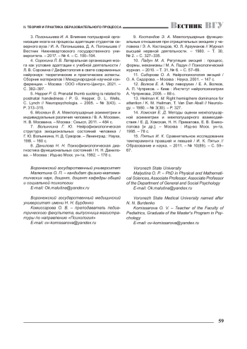 4. Сорокина Л. В. Латеральная организация мозга как условие адаптации к учебной деятельности / Л. В. Сорокина // Дефектология в свете современных нейронаук: теоретические и практические аспекты. Сборник материалов I Международной научной конференции. - Москва: ООО “Когито-Центр”, 2021. -С. 392-397. EDN: YMVINT