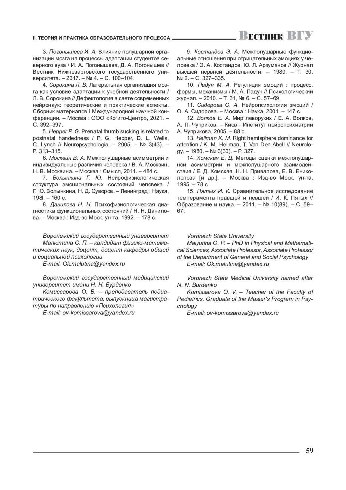 3. Погонышева И. А. Влияние полушарной организации мозга на процессы адаптации студентов северного вуза / И. А. Погонышева, Д. А. Погонышев // Вестник Нижневартовского государственного университета. - 2017. - № 4. - С. 100-104. EDN: YKYQNQ