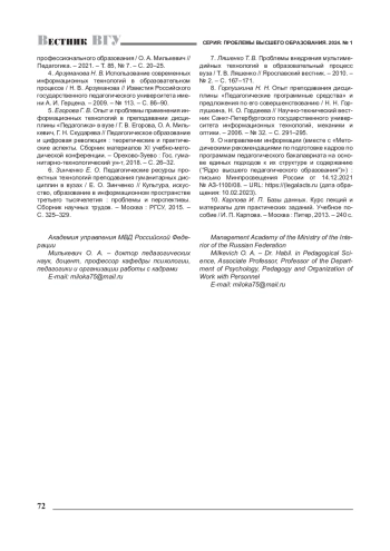 5. Егорова Г. В. Опыт и проблемы применения информационных технологий в преподавании дисциплины “Педагогика” в вузе / Г. В. Егорова, О. А. Милькевич, Г. Н. Скударева // Педагогическое образование и цифровая революция: теоретические и практические аспекты. Сборник материалов XI учебно-методической конференции. - Орехово-Зуево: Гос. гуманитарно-технологический ун-т, 2018. - С. 26-32. EDN: YWTDZY