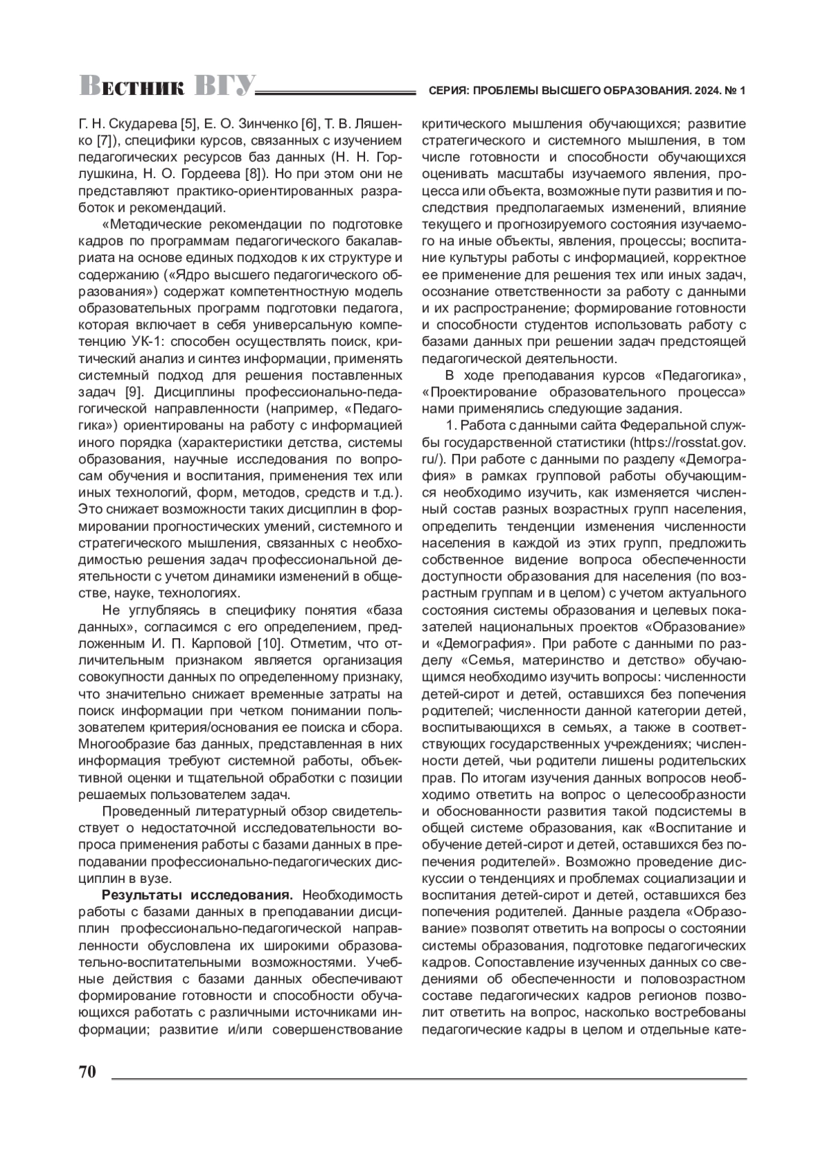 «Методические рекомендации по подготовке кадров по программам педагогического бакалавриата на основе единых подходов к их структуре и содержанию («Ядро высшего педагогического образования») содержат компетентностную модель образовательных программ подготовки педагога, которая включает в себя универсальную компетенцию УК-1: способен осуществлять поиск, критический анализ и синтез информации, применять системный подход для решения поставленных задач [9]. Дисциплины профессионально-педагогической направленности (например, «Педагогика») ориентированы на работу с информацией иного порядка (характеристики детства, системы образования, научные исследования по вопросам обучения и воспитания, применения тех или иных технологий, форм, методов, средств и т. д.). Это снижает возможности таких дисциплин в формировании прогностических умений, системного и стратегического мышления, связанных с необходимостью решения задач профессиональной деятельности с учетом динамики изменений в обществе, науке, технологиях.