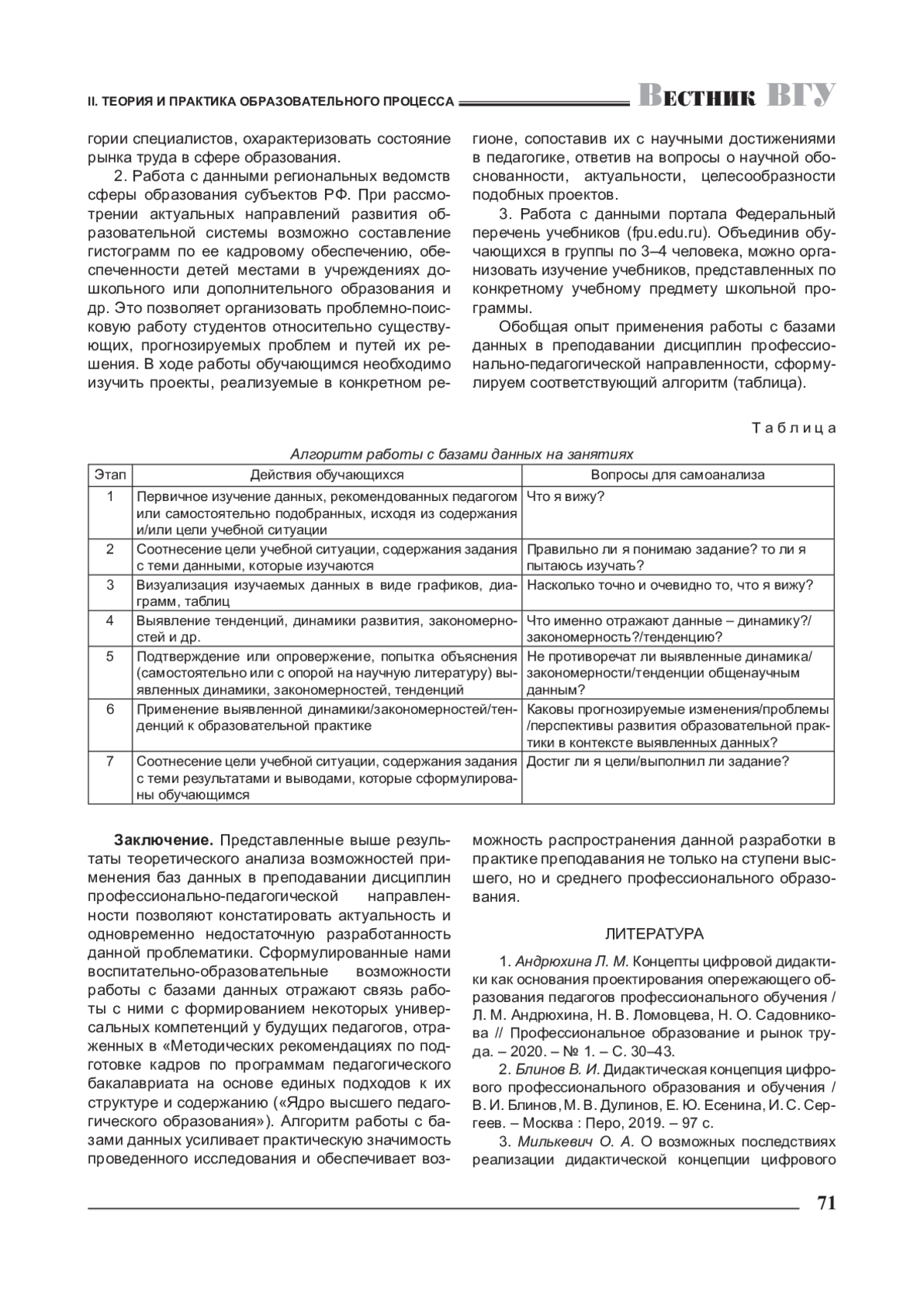 В статье представлены результаты теоретического анализа вопроса применения работы с базами данных и обобщения их применения в преподавании дисциплин профессионально-педагогической направленности в вузе. Выявлены теоретические и методические основания применения работы с базами данных в преподавании дисциплин указанной направленности. Разработанные и апробированные алгоритмы работы с базами данных и практико-ориентированные задания могут быть применены в преподавании дисциплин «Педагогика», «Проектирование в образовательном процессе» и других дисциплин при обучении бакалавров и магистров по направлению «Педагогическое образование».