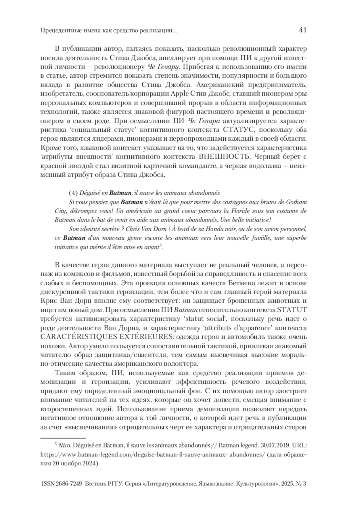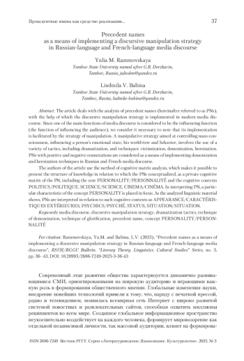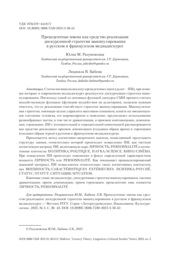 Статья посвящена анализу прецедентных имен (далее – ПИ), при помощи которых в современном медиадискурсе реализуется дискурсивная стратегия манипулирования. Поскольку одной из основных функций дискурса СМИ принято считать воздействующую функцию (функцию воздействия на аудиторию), полагаем нужным отметить, что ее реализации способствует стратегия манипулирования. Манипулятивная стратегия, имеющая целью управлять массовым сознанием, влиять на эмоциональное состояние человека, его мировоззрение и поведение, предполагает использование разнообразных тактик, в том числе драматизации, и приемов: виктимизации, демонизации, героизации. ПИ с положительной и отрицательной коннотацией рассматриваются как средство реализации приемов демонизации (создания образа врага) и героизации (создание образа героя) в русском и французском медиадискурсах.