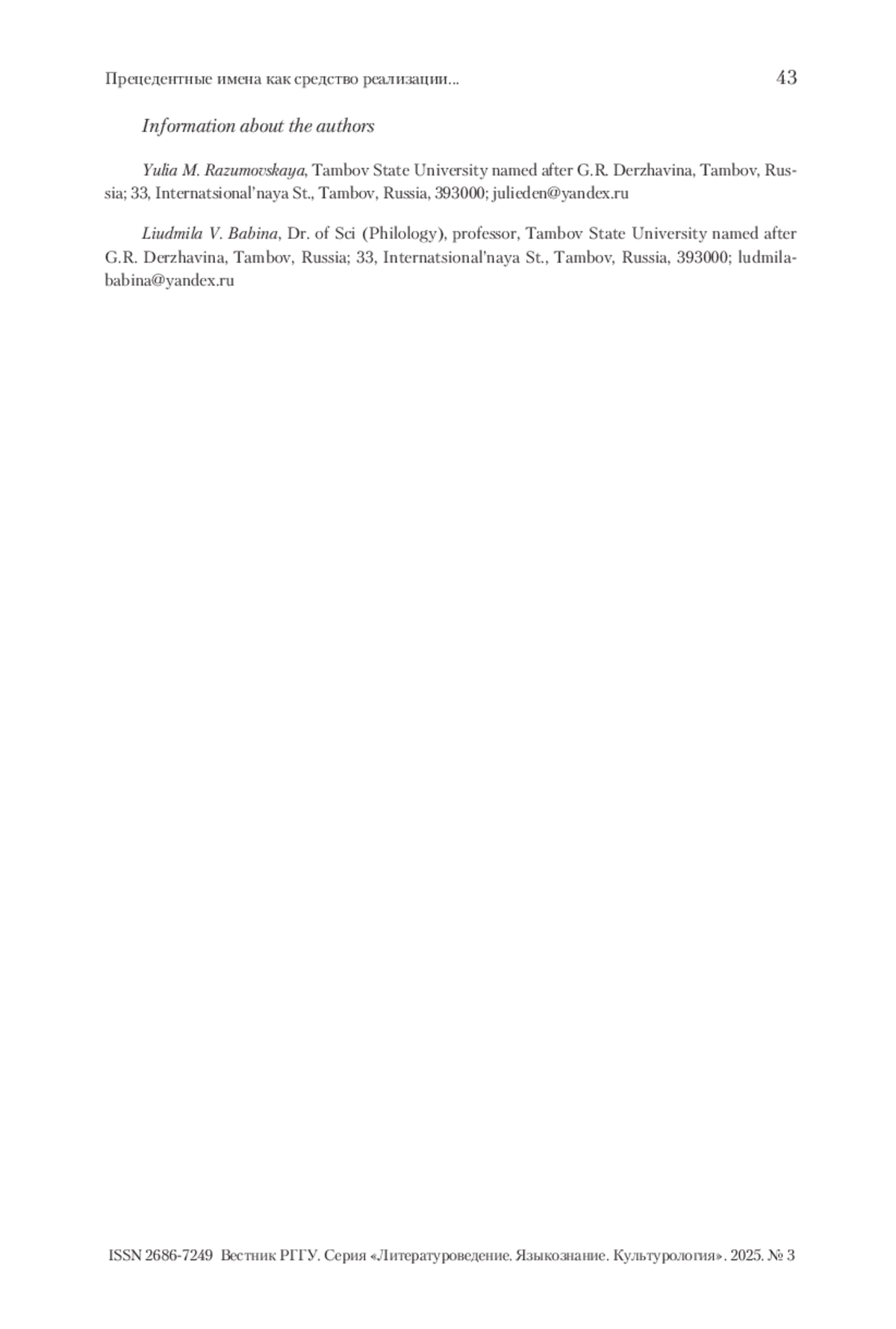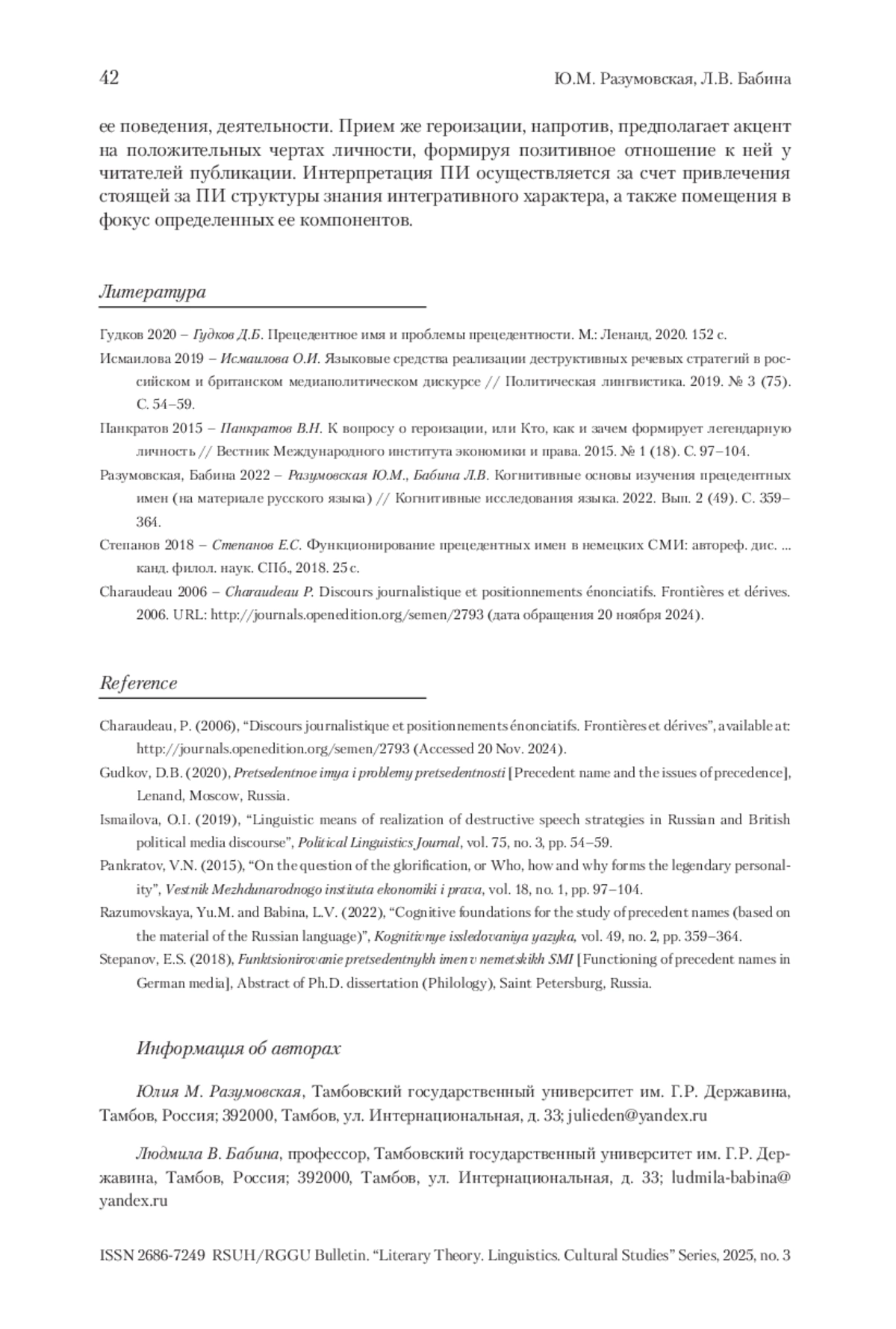 4. Разумовская, Бабина 2022 - Разумовская Ю.М., Бабина Л.В. Когнитивные основы изучения прецедентных имен (на материале русского языка) // Когнитивные исследования языка. 2022. Вып. 2 (49). С. 359-364.