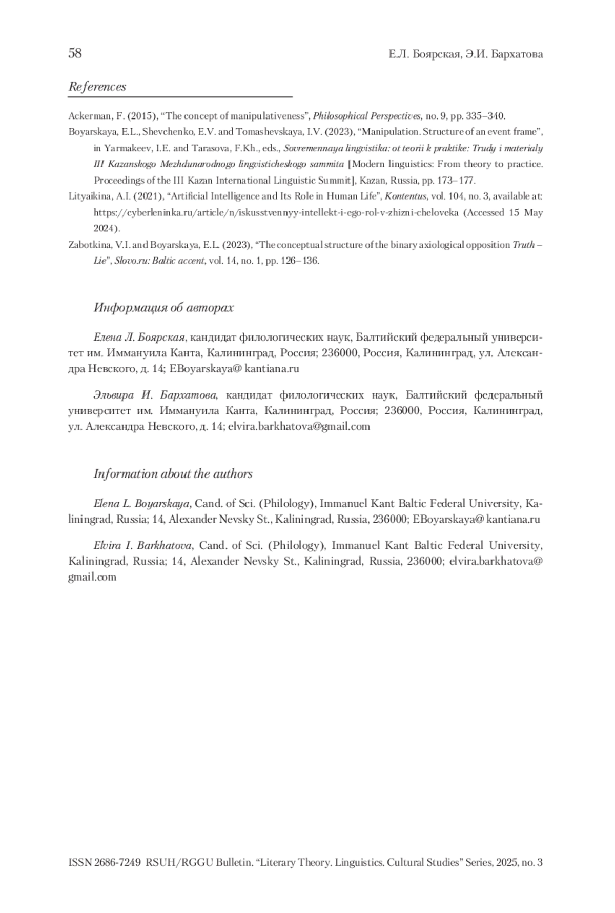 1. Боярская, Шевченко, Томашевская 2023 - Боярская Е.Л., Шевченко Е.В., Томашевская И.В. Манипуляция: структура событийного фрейма // Современная лингвистика: от теории к практике: Труды и материалы III Казанского Международного лингвистического саммита / под ред. И.Э. Ярмакеева, Ф.Х. Тарасовой. Казань, 2023. С. 173-177.