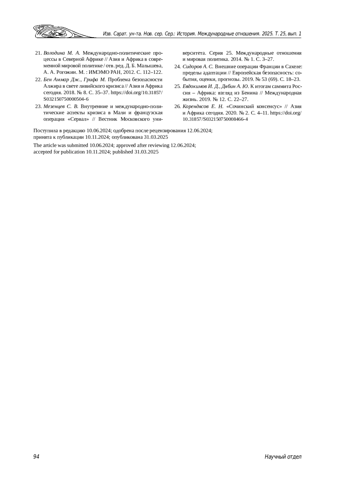 23. Мезенцев С. В. Внутренние и международно-политические аспекты кризиса в Мали и французская операция “Сервал” // Вестник Московского университета. Серия 25. Международные отношения и мировая политика. 2014. № 1. С. 3-27. EDN: SOAHDH
