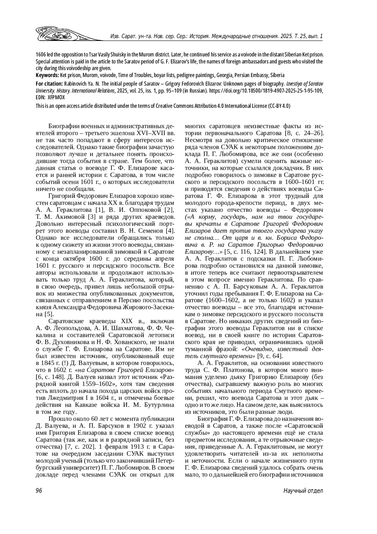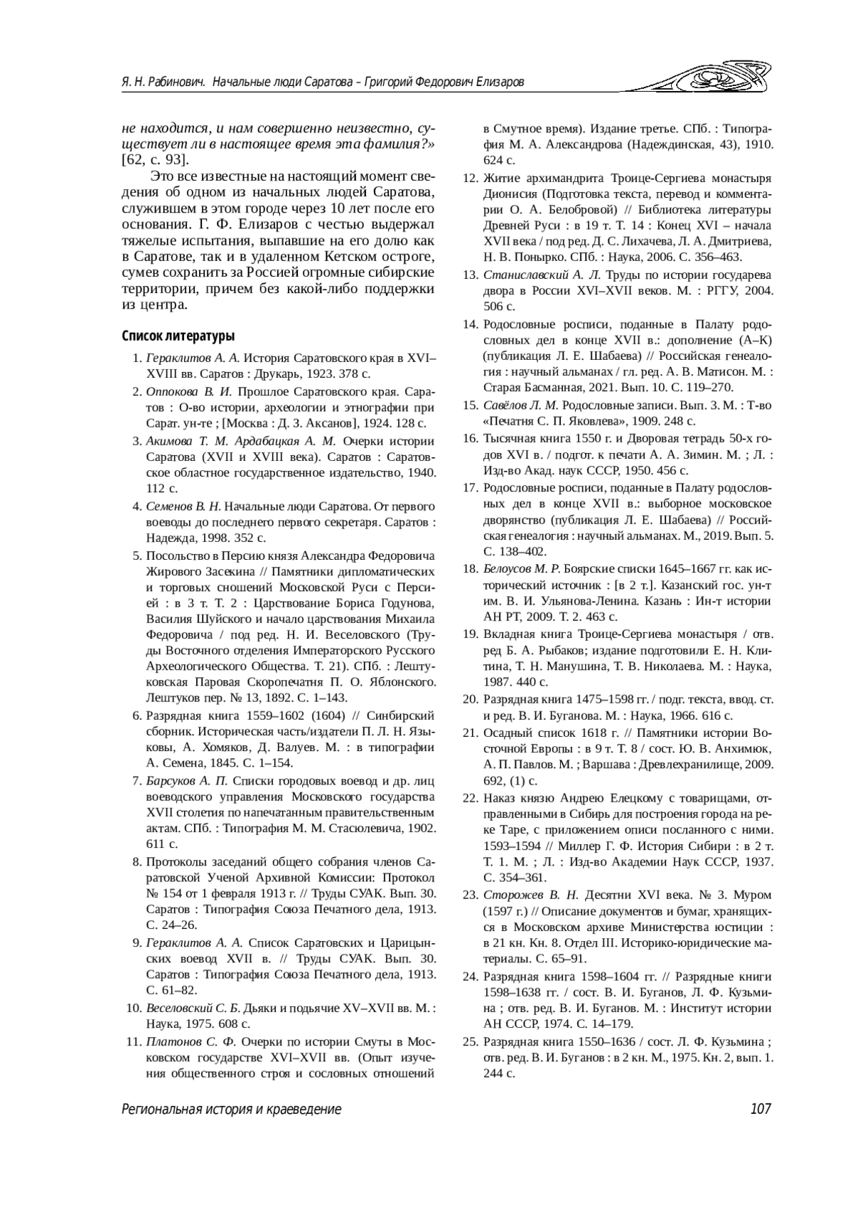 26. Рабинович Я. Н. Первоначальный Саратов в 1590-1609 гг.: историография вопроса // Известия Саратовского университета. Новая серия. Серия: История. Международные отношения. 2015. Т. 15, вып. 4. С. 90-97. DOI: 10.18500/1819-4907-2015-15-4-90-97 EDN: VPFDZP