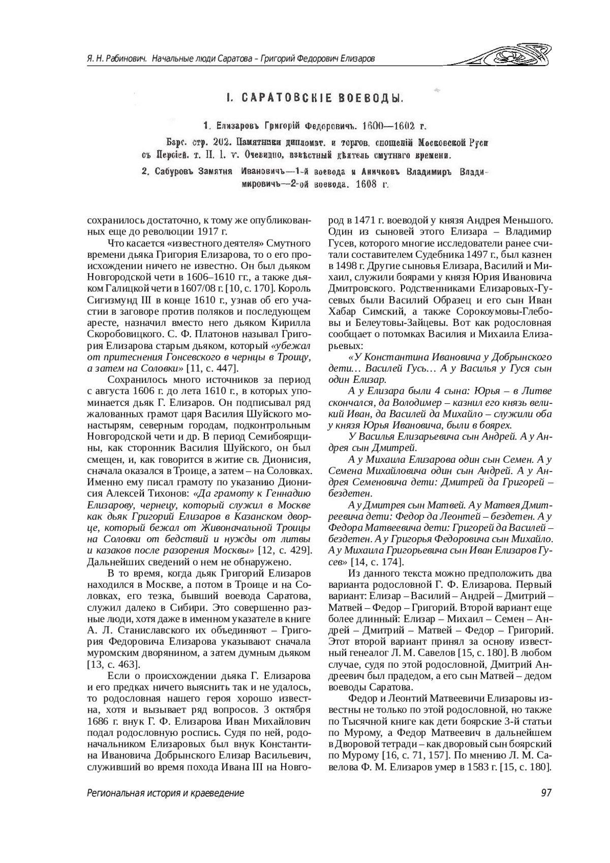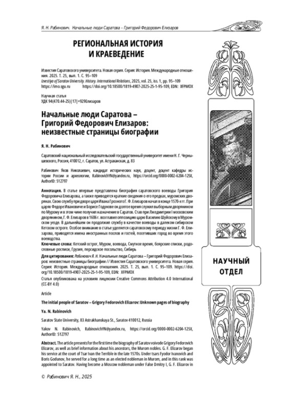 Биографиивоенныхиадминистративныхдеятелей второго– третьего эшелона XVI–XVII вв. не так часто попадают в сферу интересов исследователей. Однако такие биографии зачастую позволяют лучше и детальнее понять происходившие тогда события в стране. Тем более, что данная статья о воеводе Г. Ф. Елизарове касается и ранней истории г. Саратова, в том числе событий осени 1601 г., о которых исследователи ничего не сообщали.
