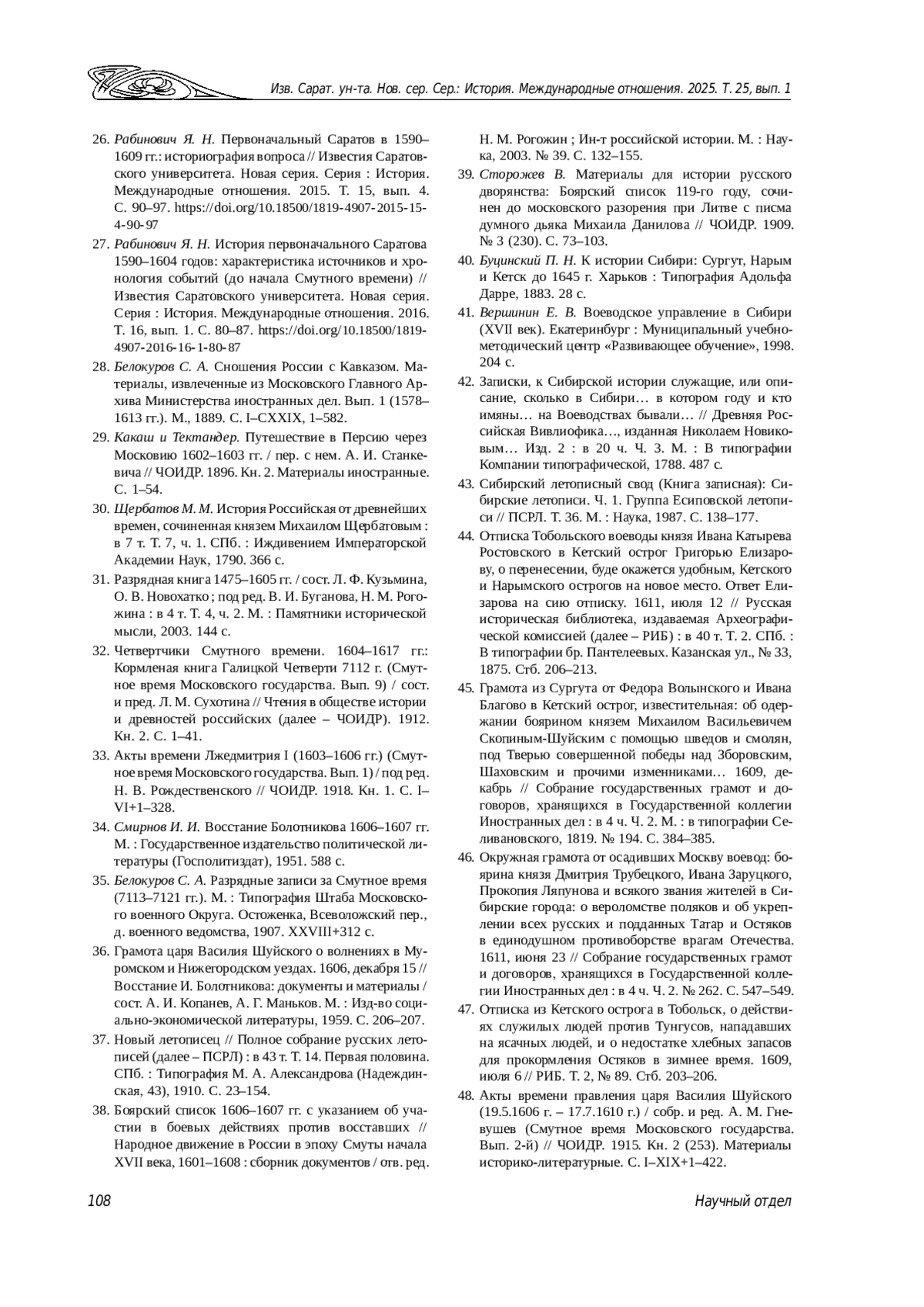 27. Рабинович Я. Н. История первоначального Саратова 1590-1604 годов: характеристика источников и хронология событий (до начала Смутного времени) // Известия Саратовского университета. Новая серия. Серия: История. Международные отношения. 2016. Т. 16, вып. 1. С. 80-87. DOI: 10.18500/1819-4907-2016-16-1-80-87 EDN: VUTTAP