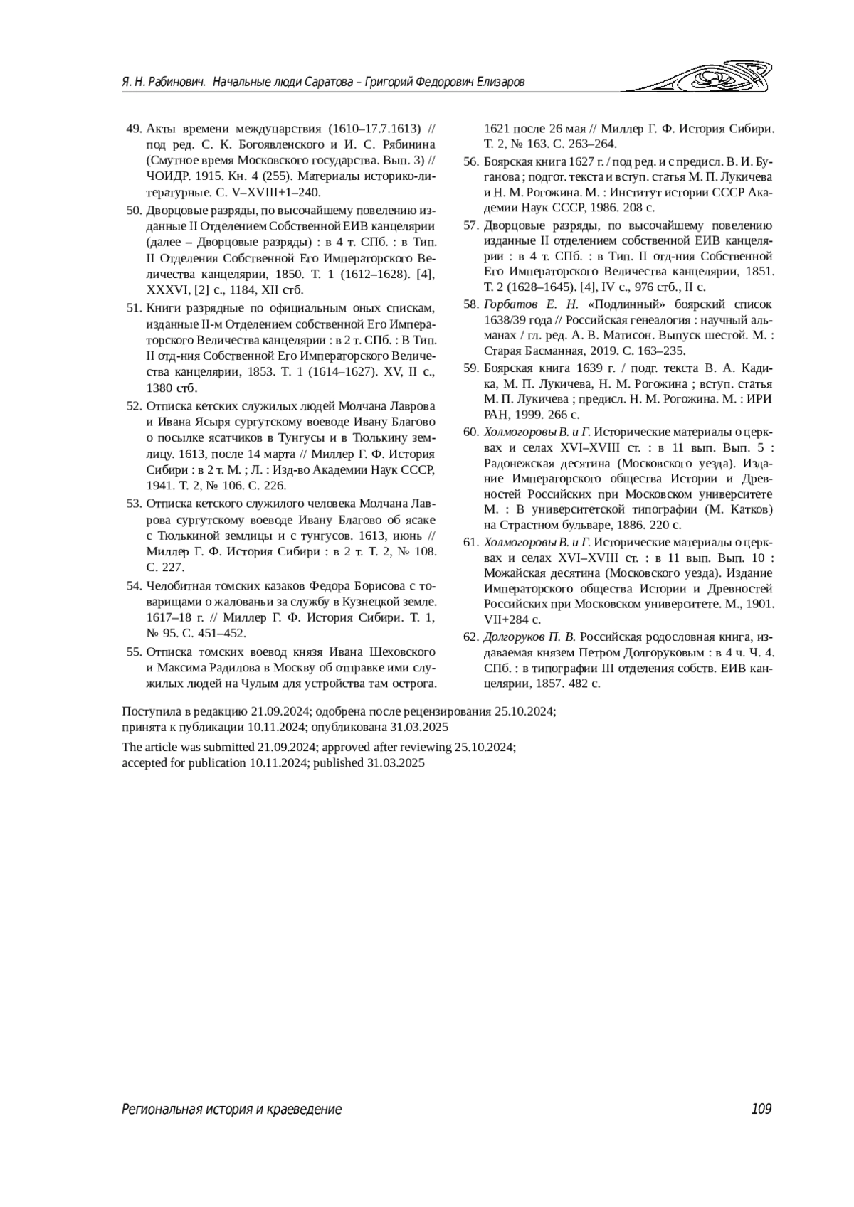 58. Горбатов Е. Н. “Подлинный” боярский список 1638/39 года // Российская генеалогия: научный альманах / гл. ред. А. В. Матисон. Выпуск шестой. М.: Старая Басманная, 2019. С. 163-235.