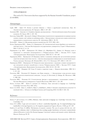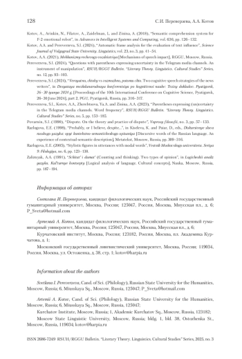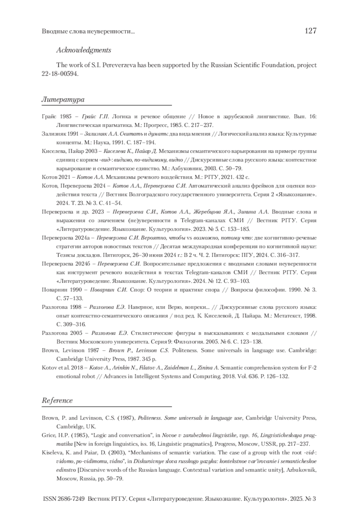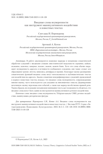 ПЕРЕВЕРЗЕВА С. И., КОТОВ А. А. ВВОДНЫЕ СЛОВА НЕУВЕРЕННОСТИ КАК ИНСТРУМЕНТ МАНИПУЛЯТИВНОГО ВОЗДЕЙСТВИЯ В НОВОСТНЫХ ТЕКСТАХ // ВЕСТНИК РГГУ. СЕРИЯ «ЛИТЕРАТУРОВЕДЕНИЕ. ЯЗЫКОЗНАНИЕ. КУЛЬТУРОЛОГИЯ». 2025. № 3