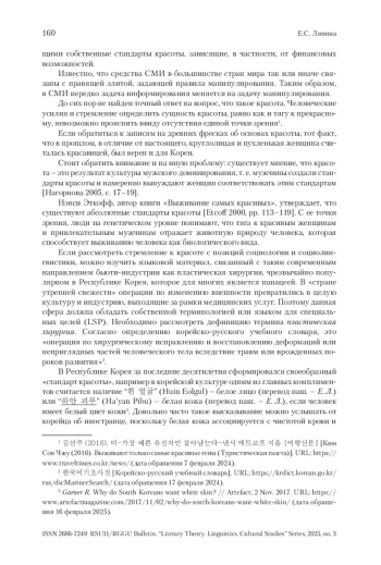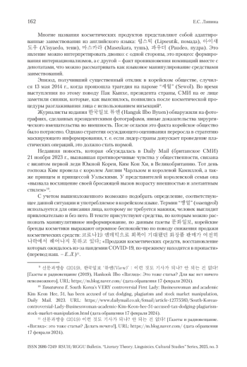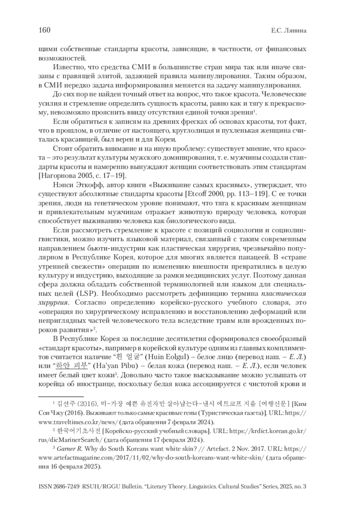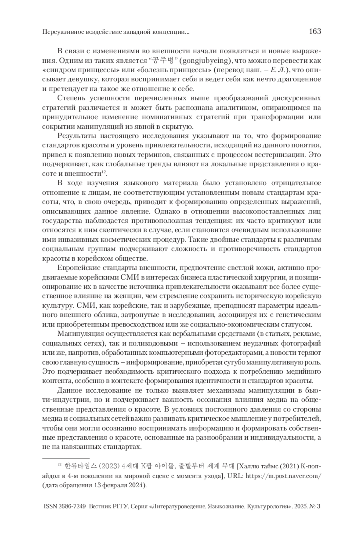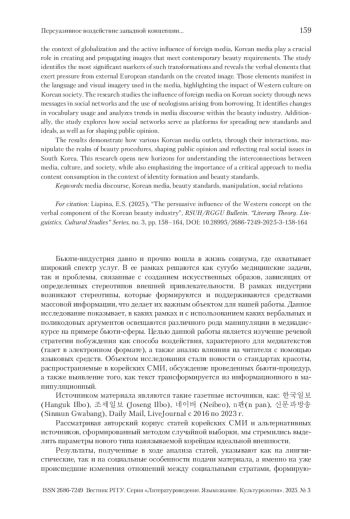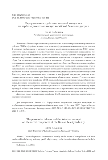 ЛЯПИНА Е. С. ПЕРСУАЗИВНОЕ ВОЗДЕЙСТВИЕ ЗАПАДНОЙ КОНЦЕПЦИИ НА ВЕРБАЛЬНУЮ СОСТАВЛЯЮЩУЮ КОРЕЙСКОЙ БЬЮТИ-ИНДУСТРИИ // ВЕСТНИК РГГУ. СЕРИЯ «ЛИТЕРАТУРОВЕДЕНИЕ. ЯЗЫКОЗНАНИЕ. КУЛЬТУРОЛОГИЯ». 2025. № 3