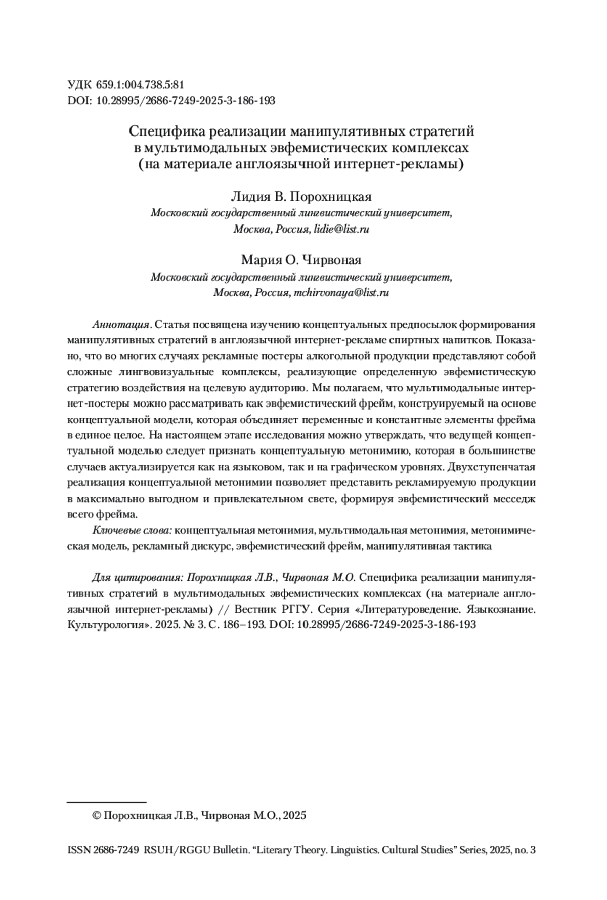 Статья посвящена изучению концептуальных предпосылок формирования манипулятивных стратегий в англоязычной интернет-рекламе спиртных напитков. Показано, что во многих случаях рекламные постеры алкогольной продукции представляют собой сложные лингвовизуальные комплексы, реализующие определенную эвфемистическую стратегию воздействия на целевую аудиторию. Мы полагаем, что мультимодальные интернет-постеры можно рассматривать как эвфемистический фрейм, конструируемый на основе концептуальной модели, которая объединяет переменные и константные элементы фрейма в единое целое. На настоящем этапе исследования можно утверждать, что ведущей концептуальной моделью следует признать концептуальную метонимию, которая в большинстве случаев актуализируется как на языковом, так и на графическом уровнях. Двухступенчатая реализация концептуальной метонимии позволяет представить рекламируемую продукции в максимально выгодном и привлекательном свете, формируя эвфемистический месседж всего фрейма.
