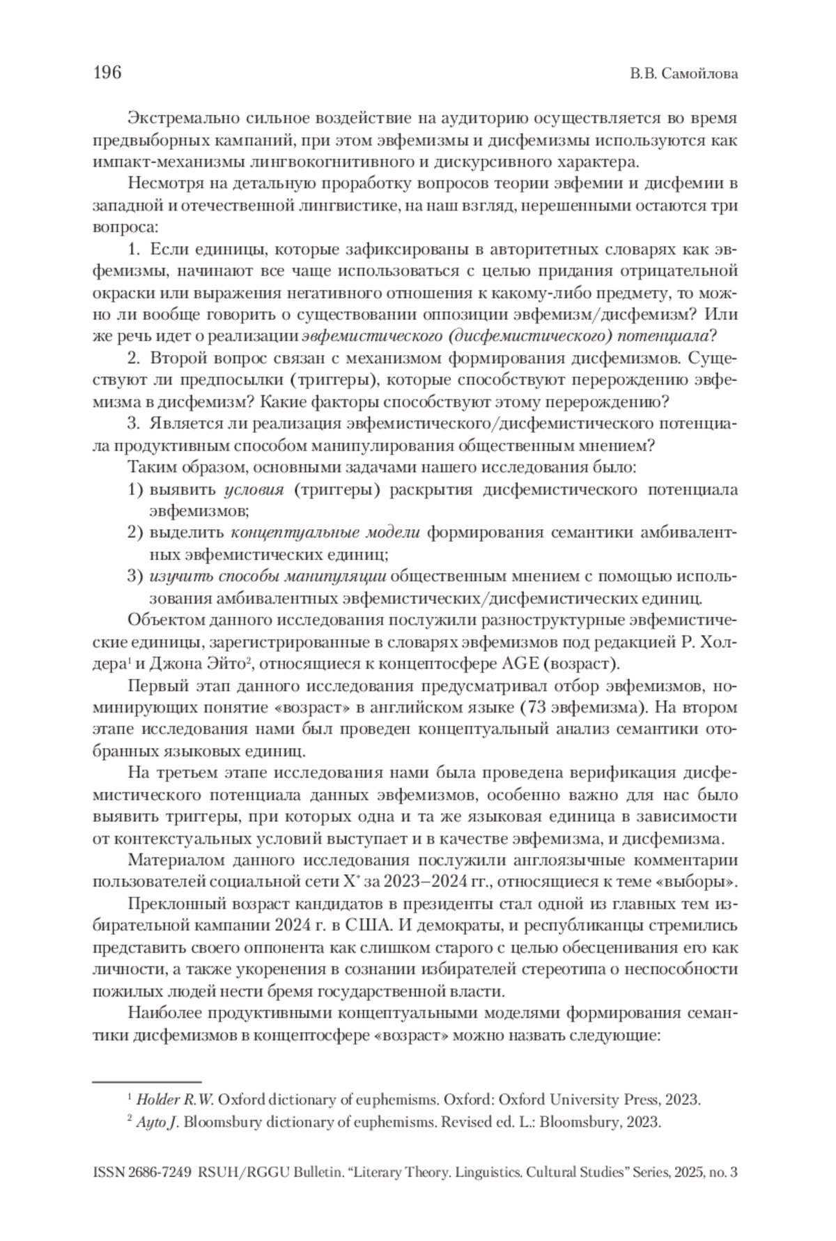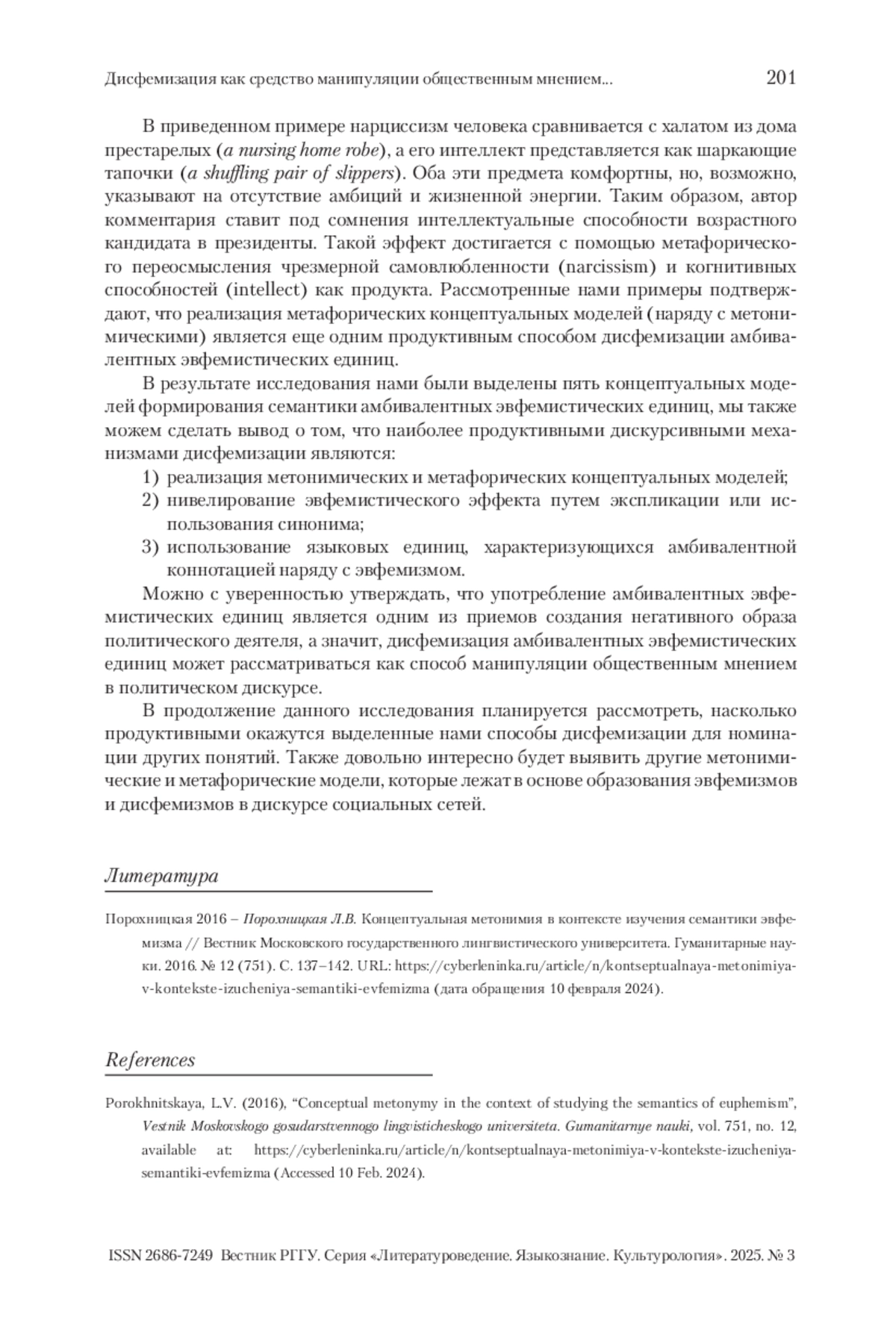 Данное исследование рассматривает дисфемизацию эвфемистических единиц как средство манипулирования общественным сознанием. Целью исследования является выявление факторов, влияющих на изменение коннотации эвфемистических единиц в дискурсе социальных сетей. В ходе исследования выдвинута гипотеза о триггерах (предпосылках) превращения эвфемизма в дисфемизм. Удалось выделить три самых продуктивных дискурсивных механизма формирования семантики амбивалентных эвфемистических единиц, а именно: 1) реализацию метафорических и метонимических концептуальных моделей; 2) нивелирование эвфемистического эффекта путем экспликации или использования синонима; 3) использование языковых единиц, характеризующихся амбивалентной коннотацией наряду с эвфемизмом. В процессе исследования были также описаны пять концептуальных моделей формирования фонда дисфемистических единиц в дискурсе социальных сетей. Сделан вывод о роли дисфемизации в процессе манипуляции общественным сознанием. На основе полученных результатов можно рассматривать дисфемизацию эвфемистических единиц как эффективный инструмент воздействия на общественное сознание и формирования определенного мнения о событиях или явлениях. Данное исследование позволяет более глубоко понять процессы манипуляции языком и выявить механизмы, с помощью которых происходит изменение коннотации слов и выражений в дискурсе социальных сетей.