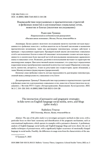 Целью данного пилотного исследования является изучение методов персуазивности в фейковых новостях с особым акцентом на их базовой таксономии и выявлении прагматических механизмов, таких как разговорные импликатуры, которые действуют в примерах с персуазивным характером. Предварительный анализ англоязычных социальных сетей и англоязычных блогов и новостей показывает использование схожих методов персуазивности со значительно более высокой частотой использования эмоционально заряженного языка в социальных сетях. Возможно, различия в использовании вытекают из характеристик анализируемых жанров. Наш качественный анализ показывает, что существует определенная корреляция между пренебрежением максимой количества и методами Обращения к популярности, ценностям, авторитету, Атаки на репутацию (все подкатегории, кроме обзываний), а также Манипулятивных формулировок (преувеличений).