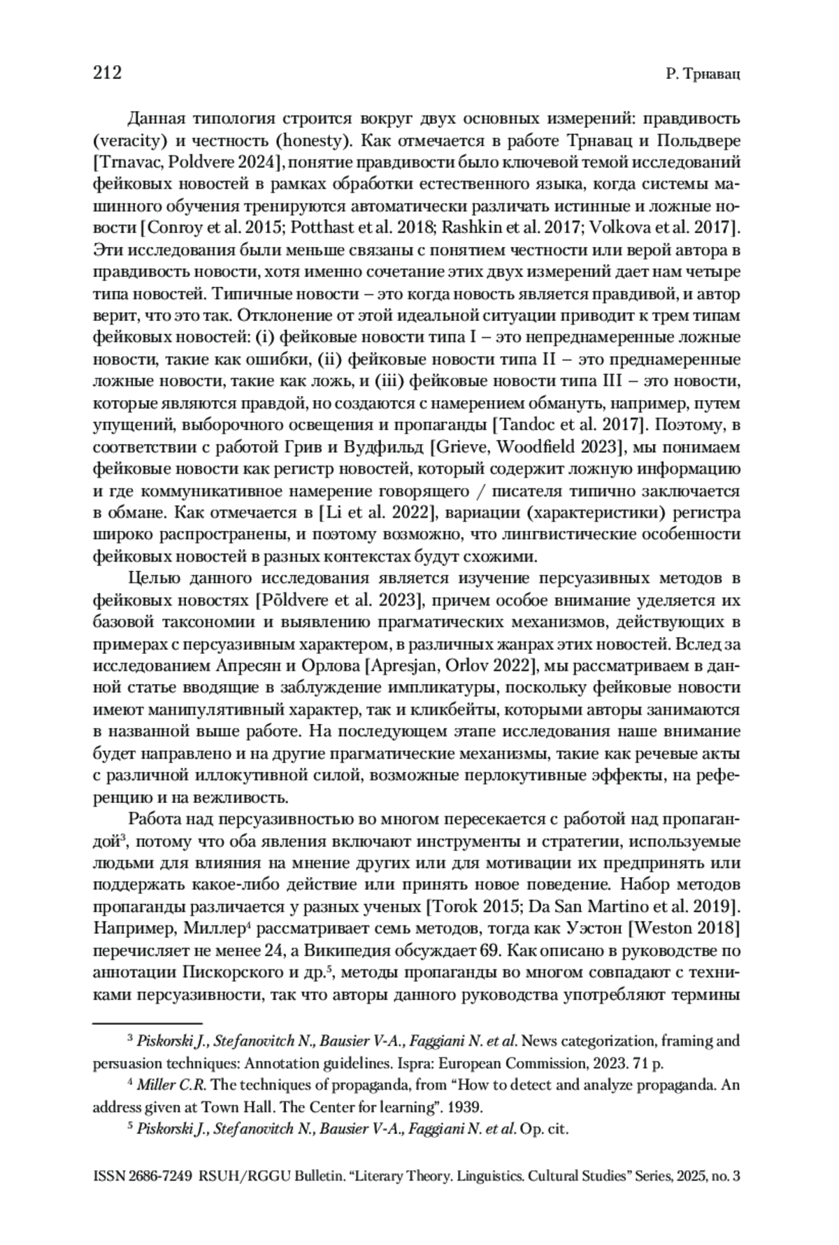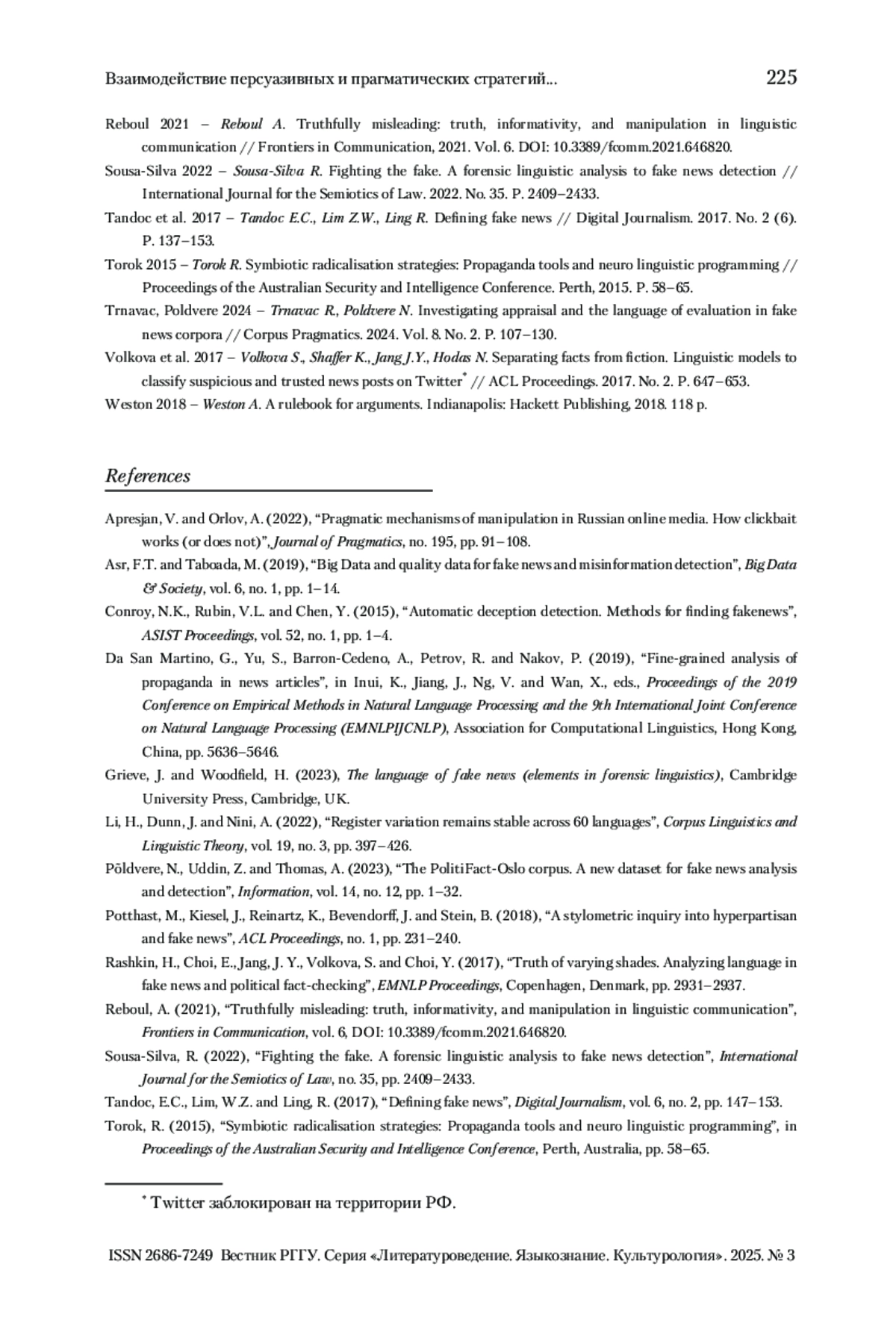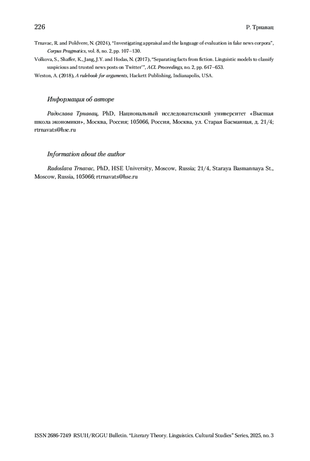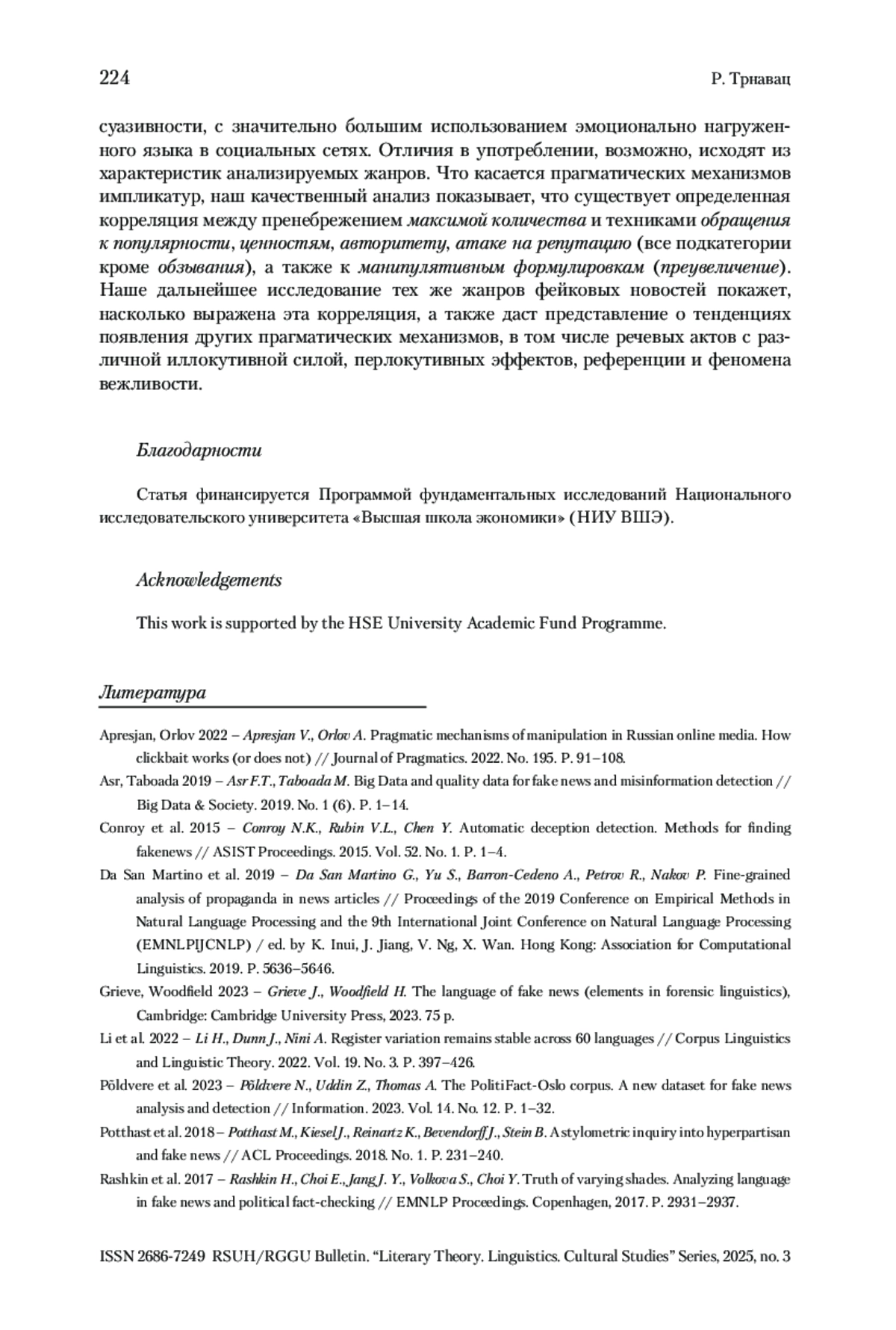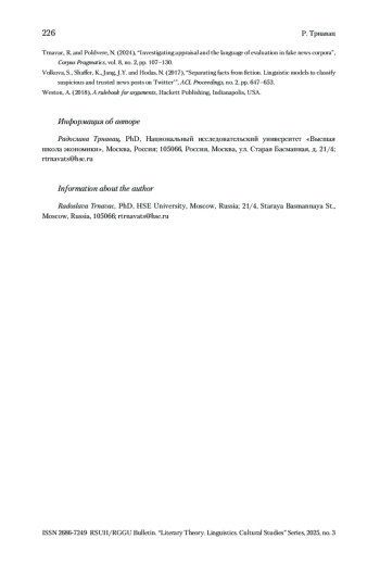 14. Trnavac, Poldvere 2024 - Trnavac R., Poldvere N. Investigating appraisal and the language of evaluation in fake news corpora // Corpus Pragmatics. 2024. Vol. 8. No. 2. P. 107-130.