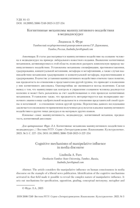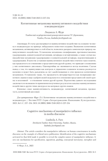 В статье рассматривается манипулятивное воздействие на сознание человека в медиадискурсе на примере либерального новостного издания. Выявление когнитивных механизмов, активизируемых в этой области, позволило раскрыть комплексную природу манипулятивного воздействия. Установлены механизмы спецификации, противопоставления, градуирования, концептуальной метонимии, метафоры и метафтонимии, а также случаи взаимодействия механизмов градуирования и концептуальной метафоры, перспективизации и градуирования. В качестве установки манипулятивного воздействия отмечено такое понятие, как предвзятость по отношению к представителям другой группы, что приводит к появлению у них когнитивного диссонанса. Однопартийцы же оцениваются всегда позитивно. Сделан вывод о том, что манипуляция как контроль и управление сознанием человека реализуется косвенно и может быть разъяснена за счет задействованных в этих процессах когнитивных механизмов. Установлено также, что предвзятость интерпретируется как поляризация оценочного знания в виде одобрительной модальности в отношении представителей своей группы и негативной – в отношении членов другой группы. Перспектива данного исследования заключается в возможности применения полученных результатов в анализе манипулятивного воздействия в других типах дискурса и на материале других языков.