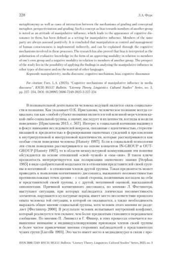 Данное исследование рассматривает дисфемизацию эвфемистических единиц как средство манипулирования общественным сознанием. Целью исследования является выявление факторов, влияющих на изменение коннотации эвфемистических единиц в дискурсе социальных сетей. В ходе исследования выдвинута гипотеза о триггерах (предпосылках) превращения эвфемизма в дисфемизм. Удалось выделить три самых продуктивных дискурсивных механизма формирования семантики амбивалентных эвфемистических единиц, а именно: 1) реализацию метафорических и метонимических концептуальных моделей; 2) нивелирование эвфемистического эффекта путем экспликации или использования синонима; 3) использование языковых единиц, характеризующихся амбивалентной коннотацией наряду с эвфемизмом. В процессе исследования были также описаны пять концептуальных моделей формирования фонда дисфемистических единиц в дискурсе социальных сетей. Сделан вывод о роли дисфемизации в процессе манипуляции общественным сознанием. На основе полученных результатов можно рассматривать дисфемизацию эвфемистических единиц как эффективный инструмент воздействия на общественное сознание и формирования определенного мнения о событиях или явлениях. Данное исследование позволяет более глубоко понять процессы манипуляции языком и выявить механизмы, с помощью которых происходит изменение коннотации слов и выражений в дискурсе социальных сетей.